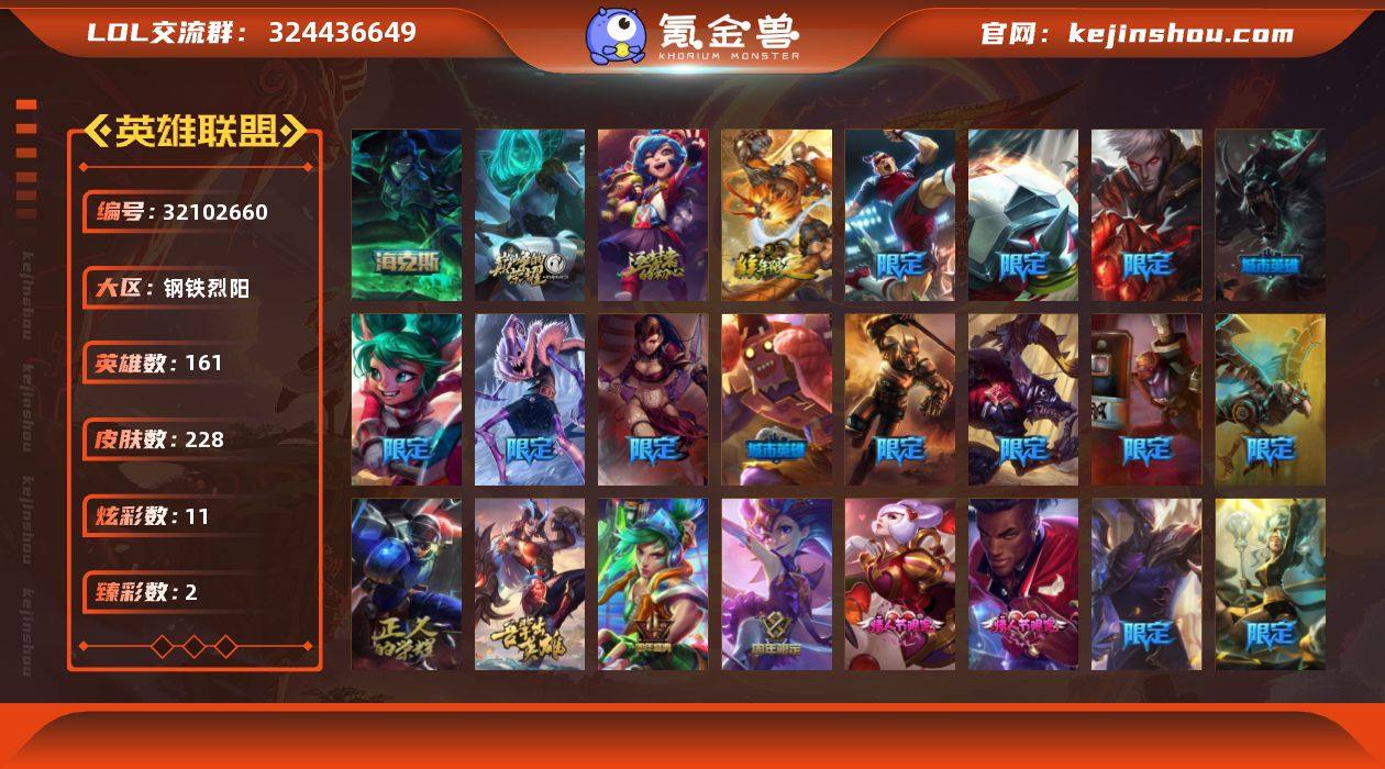 实名:不可二次实名 英雄数:161 皮肤数:228 等级:204 炫彩数:11 臻彩皮肤总数:2 神话皮肤数:3 摄魂 薇恩,源代码 乐芙兰,10周年安妮 美猴王 孙悟空,制胜金靴李青,制胜金球拉莫斯,征服者韦鲁斯,暗影沃里克,波比的巧克力工坊,糖果使徒费德提克,女猎手希维尔,蒙多蒙多,警用试作体K-9内瑟斯,都铎王朝图奇,防暴士兵 辛吉德,钢铁之翼 艾尼维亚,防暴天使 凯尔,玉剑传说 舞龙卫,4周年锐雯,8周年佐伊,觅心魔灵 奥利安娜,觅心游侠卢锡安,胜利之剑 亚托克斯,S1FNC迦娜,S1FNC嘉文四世,S1FNC卡尔萨斯,S1FNC库奇,S2暗杀星蒙多,S2暗杀星努努,S2暗杀星伊泽瑞尔,S3SKTT1婕拉,S4SSW炼金,S5SKTT1雷克顿,S8IG艾瑞莉娅,S8IG卡莎,S8IG乐芙兰,冰雪风暴希维尔,冰雪节格雷福斯,冰雪节 辛吉德,冬季仙境卡尔玛,魄罗骑士瑟庄妮,圣诞老人 古拉加斯,圣诞玩偶波比,喜庆之树 茂凯,雪默丁格,雪装奈德丽,奥德赛 吉格斯,鬼影森森茂凯,鬼影重重魔腾,魅惑女巫莫甘娜 战地机甲 厄加特,屠龙勇士 潘森,女皇 艾希,红色男爵 库奇,符文战熊 沃利贝尔,地狱之门卫士 加里奥,冰川巨兽 墨菲特,霸天零式 赛恩,最终BOSS 维迦,战斗学院 伊泽瑞尔,战地巨兽 科加斯,源计划:林 易,源计划:联合 艾希,星之守护者 霞,星之守护者 金克丝,未来战士 凯特琳,天煞 劫,女警狙击 凯特琳,烈焰雄心 崔丝塔娜,炼狱魔犬 内瑟斯,枯萎之壤 泽拉斯,黑夜使者 亚索,灌篮高手 德莱厄斯,恶魔男爵 瑞兹,电玩女神 娑娜,第三类接触 黑默丁格,冰霜之刃 艾瑞莉娅 死亡领主 莫德凯撒,暮星之羽 霞,源计划: 风 亚索,腥红之月 亚索,西部牛仔 亚索,霓虹杀拳 蔚,邪恶魔人 扎克,战场公主 希维尔,暗黑武士 雷恩加尔,穿着正装的恶魔 维迦,战争血统 蒙多,圣光审判 凯尔,蓝焰梦魔 魔腾,掠星魔刃 卡萨丁,海牛猎手 菲兹,虚空海灵 菲兹,职业杀手 卢锡安,源计划:雷 卢锡安,血羽凤凰 奎因,冰川勇者 伊泽瑞尔,重生之沙 费德提克,圣洁化身 索拉卡,飞车暴走族 古拉加斯,古墓丽影 凯特琳,法老王朝 内瑟斯,死神 卡尔萨斯,永恒之森 赫卡里姆,五星大厨 塔姆,女船长 厄运小姐,法国皇室 厄运小姐,冰霜烈焰 安妮,安伯斯与提妮,至高君王 玛尔扎哈,腥红之月 鬼武者 慎,永恒之森 巴德,银河魔装机神 希瓦娜,飞越疯人院 萨科,贵族血统 萨科,无限烈焰 黛安娜,西部牛仔 烬,弗雷尔卓德 塔莉垭,枯萎之壤 雷克顿,最后一只恐龙 纳尔,萌侦探 喵尔摩斯,野火之藤 婕拉,沙之守护 卡兹克,爵士 克烈,荒野豺狼 沃里克,狼外婆 沃里克,暗夜猫女 卡特琳娜,源计划:雄心 卡特琳娜,地下拳王 李青,防弹武僧 李青,龙骑统帅 嘉文四世,星际之门 阿兹尔,苍穹之光 薇恩,北领前线 斯维因,星之守护者 迦娜,腥红之月 锤石,驯龙女巫 璐璐,仲裁圣女 辛德拉,腥红之月 伊莉丝,源计划:火 菲奥娜,霸天剑魔 亚托克斯,源代码 丽桑卓,冰晶之核 布兰德,冲击之刃 劫,源计划:阴 劫,奥术大师 吉格斯,绞肉机角斗士 赵信,银色之牙 阿卡丽,铁血女忍 阿卡丽,恐惧新星 普朗克 卖家说:看上就拍吧