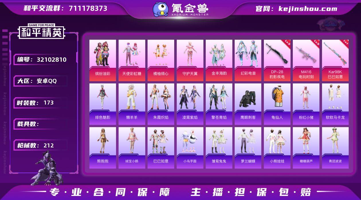【特价出售/店主推荐】安卓 手Q-6粉装-4特效枪-0载具-2粉色飞行器-67167热力值-10王牌印记-173套装-212枪皮 【热门品类】:粉装-缤纷油彩,套装-龟仙人,套装-粉红小猪,套装-软软马卡龙 【粉色套装】:粉装-天使彩虹糖,粉装-缤纷油彩,粉装-橘柚倾心,角色-守护天翼,粉装-金丰海韵,粉装-幻彩电音 【粉色枪皮等级】:M416-电玩时刻(五级),Kar98K-巳巳如意(一级),Mk14-福马献瑞(一级),DP-28-豹影疾电(五级) 【粉色枪皮】:M416-电玩时刻,Kar98K-巳巳如意,Mk14-福马献瑞,DP-28-豹影疾电 【粉色飞行器】:炫彩糖果飞行器,极意拳锋飞行器 【粉色降落伞】:暗夜玫瑰降落伞,飒粉甜心降落伞,未来歌姬降落伞,萌酷奶龙降落伞,精灵梦叶罗丽降落伞,金丰海韵降落伞,临安公主降落伞,星穹咏叹调降落伞,异瞳寒姬降落伞,极意拳锋降落伞,炫彩糖果降落伞,霁蓝缠春降落伞 【稀有套装】:套装-龟仙人,套装-熊抱抱,套装-绒宝小鹅,套装-巳巳如意,套装-小鸟芋圆,套装-炫彩糖果,套装-马上来财,套装-雏菊兔兔,套装-萝兰蝴蝶,套装-小熊娃娃,套装-糖糖葫芦,套装-青团波波,套装-棉花软糖,角色-都市丽猫,角色-俏兔智灵,角色-光矢逐梦,套装-燕燕于飞,套装-鱼渊荷华,套装-紫幽梦,套装-蓝冰羽,套装-星渊小夜曲,套装-彩虹兔,套装-云朵鹅,套装-雪绒豹,角色-乐音,套装-蓝海鲸歌,套装-朱霞炽焰,套装-凌霄紫焰,套装-擎苍青焰,玩偶服-懒羊羊,角色-绯色魅影 【稀有枪皮】:AKM-夜灯,AKM-彩虹符号,AKM-破晓战魂,AKM-萌趣颜团子,AKM-虎虎生威,AKM-龙的传人,M16A4-幻世战舞者,M16A4-红色方程式,M16A4-蓝色火焰,SCAR-L-炫彩节奏,SCAR-L-玉兔迎春,SCAR-L-红色方程式,M416-糯团青竹,M416-红色方程式,M416-蓝色火焰,GROZA-彩虹符号,GROZA-恐龙拽拽,GROZA-懵萌河马,GROZA-春暖花开,GROZA-...