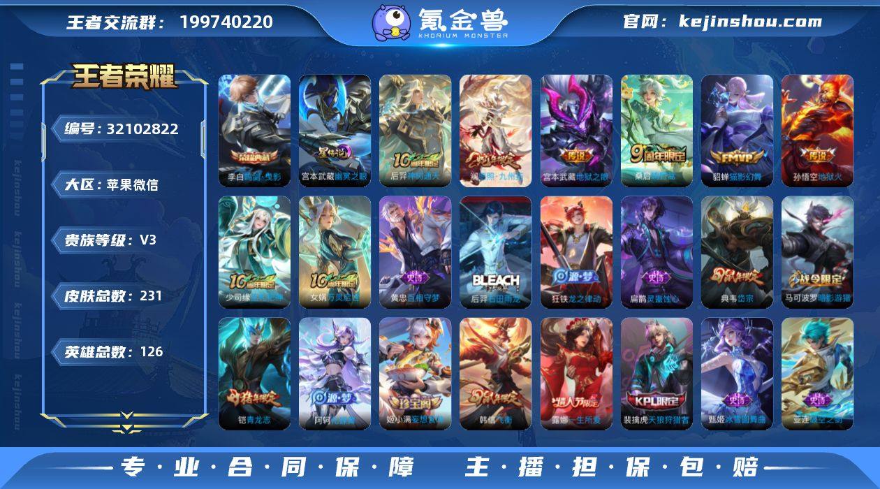 苹果WX-V3-最强王者段位-126英雄-231皮肤-1典藏皮肤-6传说-69史诗 【英雄全皮】:影全皮 【荣耀典藏】:李白鸣剑曳影 【传说皮肤】:后羿神树通天,澜愿照九州拓,桑启鸣野蒿,貂蝉猫影幻舞,宫本武藏地狱之眼,孙悟空地狱火 【限定皮肤】:姜子牙天穹之誓,狄仁杰阴阳师,赵云皇家上将,孙尚香蔷薇恋人,庄周高山流水,高渐离死亡摇滚,阿轲迷踪丽影,吕布猎兽之王,周瑜赤莲之焰,夏侯惇朔风刀,甄姬游园惊梦,曹操烛龙,曹操天狼征服者,典韦穷奇,典韦岱宗,马可波罗暗影游猎,狄仁杰魔术师,狄仁杰万华元夜,达摩沙漠行僧,项羽海滩派对,老夫子醍醐杖,露娜一生所爱,刘邦夺宝奇兵,韩信飞衡,兰陵王驯魔猎人,兰陵王金庭之子,牛魔御旌,李元芳银河之约,李元芳云中旅人,钟馗驱傩正仪,杨玉环遇见飞天,雅典娜黎明之约,鬼谷子原初探秘者,鬼谷子五谷丰年,铠青龙志,苏烈千军破阵,百里玄策原初追逐者,弈星混沌棋,沈梦溪星空之诺,沈梦溪大漠名商,明世隐疑决卦,裴擒虎天狼狩猎者,裴擒虎李小龙,狂铁御狮,米莱狄御霄,盾山御銮,猪八戒西部大镖客,上官婉儿梁祝,阿古朵江河有灵,张良古海寻踪,高渐离燃音魔法,妲己灵卜魔法,鬼谷子天穹祈灯,姬小满妄想食味,沈梦溪龙舞盛年,鲁班七号蔬乡物语,李元芳蔬乡物语,刘邦剑破天穹,程咬金群星魔术团,镜青焰无极,项羽苍威无极,周瑜熔金海岸 【年限皮肤】:铠青龙志,典韦岱宗,韩信飞衡,澜愿照九州拓 【赛季限定】:曹操烛龙,典韦穷奇,狂铁御狮,米莱狄御霄,牛魔御旌,盾山御銮,夏侯惇朔风刀,弈星混沌棋,明世隐疑决卦,老夫子醍醐杖,鬼谷子原初探秘者,狄仁杰万华元夜,钟馗驱傩正仪,苏烈千军破阵,达摩沙漠行僧,兰陵王金庭之子,沈梦溪大漠名商,李元芳云中旅人,张良古海寻踪,鬼谷子天穹祈灯,刘邦剑破天穹,姜子牙天穹之誓,东皇太...