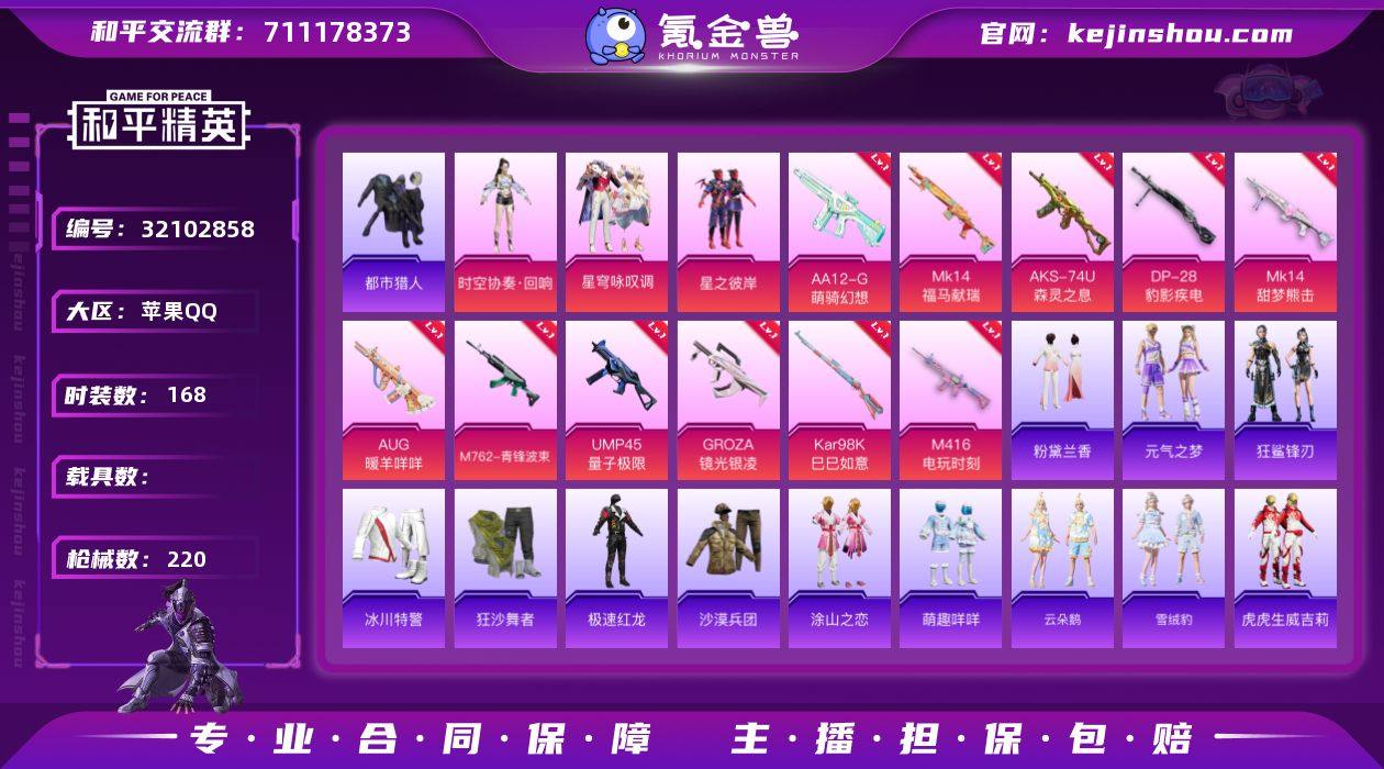 M1046719【身法号3粉装-11特效枪都市猎人 暗影哥特 浪漫天命 】苹果手Q-3粉装-11特效枪-168套装-220枪皮-6王牌印记-超级王牌2星-60535热力值【3粉装】星穹咏叹调 星之彼岸 时空协奏·回响【11特效枪】DP-28-豹影疾电[5级] UMP45-量子极限[5级] AUG-暖羊咩咩[5级] Mk14-福马献瑞[5级] M762-青锋波束[5级] AA12-G-萌骑幻想[5级] Mk14-甜梦熊击[5级] GROZA-镜光银凌[5级] Kar98K-巳巳如意[5级] M416-电玩时刻[5级] AKS-74U-森灵之息[5级]【4稀有】都市猎人 狂沙舞者 浪漫天命 暗影哥特【8飞行器】鸡智如我飞行器 马上有福飞行器 炫彩糖果飞行器 粉色滑翔尾迹 异域银装飞行器 狂鲨锋刃飞行器 破刃行动尾迹 顶峰精英尾迹【370其它衣服和枪皮】特种颜团子 特训学院 白糯汤圆 香桃花海 沙漠兵团 龙魂突击队 星梦畅游 幻彩翩翩 潮流炫酷 Alan Walker 萝兰蝴蝶 雪绒豹 虚音幻奏 竞技名士 角色-蝶吟花词 绮丽涂鸦 热血青春 玉兔迎春 萌趣颜团子 格斗先锋 蝶变 极速红龙 炫蓝之夏 光之冒险 SS31特训 红色运动 巳巳如意 红釉青花 湖蓝色名流 探宝勇士 狙击之神 涂山之恋 纯真浪花 角色-夜瞳黯灵 福星高照 人气偶像 超能勇士 麻辣教官 俏皮奶喵 大橘大利 福马献瑞 凌霄紫焰 青涩年华 朱霞炽焰 马上有钱 绒宝小鹅 狂鲨锋刃 灼焰舞者 萌黄之夏 SS18特训 空投萌叽 智谋强哥 都市魅力 街头风暴 SS23特训 漫游都市 猎鹰 SS19特训 紫幽梦 绯格组合 冰川特警 热情海星 酒红色名流 长空猛禽 幻影武者 缤纷果语 极地朋克 青年教官 战术大师 破蛋小黄鸡 街头潮人 怒火燎原 SS25特训 完美偶像 白熊同盟 SS24特训 角色-情公主 炫彩糖果 角色-白光莹 云朵鹅 黄色伏地魔 荣耀 萌鸡速递 蓝色运动 竞技达人朋克 SS36特训 夏日倾情 音速流光 萌趣咩咩 SS29特训 破晓战魂 甜蜜熊情侣 海盐绵绵冰 吉莉礼服 角色-摩登魅