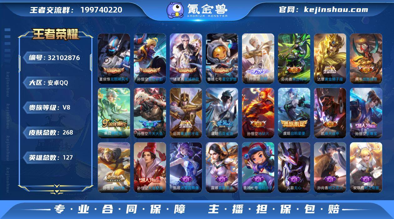 V8 4典藏 1无双 11传说 268皮肤 127英雄 【4水晶】鲁班七号-星空梦想,孙悟空-全息碎影,夏侯惇-无限飓风号,诸葛亮-星域神启【1无双】孙悟空-无相【11传说】孙悟空-齐天大圣,达摩-黄金狮子座,后羿-黄金射手座,铠-绛天战甲,孙尚香-末日机甲,孙悟空-地狱火,虞姬-云霓雀翎,虞姬-启明星使,典韦-战鼓燎原,桑启-鸣野蒿【52史诗】元歌-无心,鬼谷子-五谷丰年,赵云-未来纪元,阿轲-节奏热浪,安琪拉-心灵骇客,安琪拉-时之奇旅,白起-星夜王子,蔡文姬-舞动绿茵,曹操-幽灵船长,嫦娥-拒霜思,程咬金-功夫厨神,妲己-女仆咖啡,妲己-魅力维加斯,妲己-热情桑巴,大乔-猫狗日记,狄仁杰-魔术师,狄仁杰-鹰眼统帅,貂蝉-圣诞恋歌,宫本武藏-鬼剑武藏,韩信-白龙吟,兰陵王-暗隐猎兽者,李白-千年之狐,廉颇-地狱岩魂,刘禅-绅士熊喵,露娜-紫霞仙子,鲁班七号-电玩小子,吕布-圣诞狂欢,吕布-末日机甲,上官婉儿-梁祝,孙策-猫狗日记,孙尚香-水果甜心,孙悟空-大圣娶亲,孙尚香-时之恋人,孙悟空-至尊宝,孙悟空-孙行者,王昭君-偶像歌手,项羽-苍穹之光,项羽-霸王别姬,小乔-缤纷独角兽,雅典娜-冰冠公主,雅典娜-黎明之约,亚瑟-心灵战警,杨玉环-遇见飞天,杨戬-天秀·启明,云中君-纤云弄巧,张飞-乱世虎臣,赵云-皇家上将,甄姬-冰雪圆舞曲,诸葛亮-黄金分割率,庄周-高山流水,鲁班七号-蔬乡物语,蒙犽-百解令