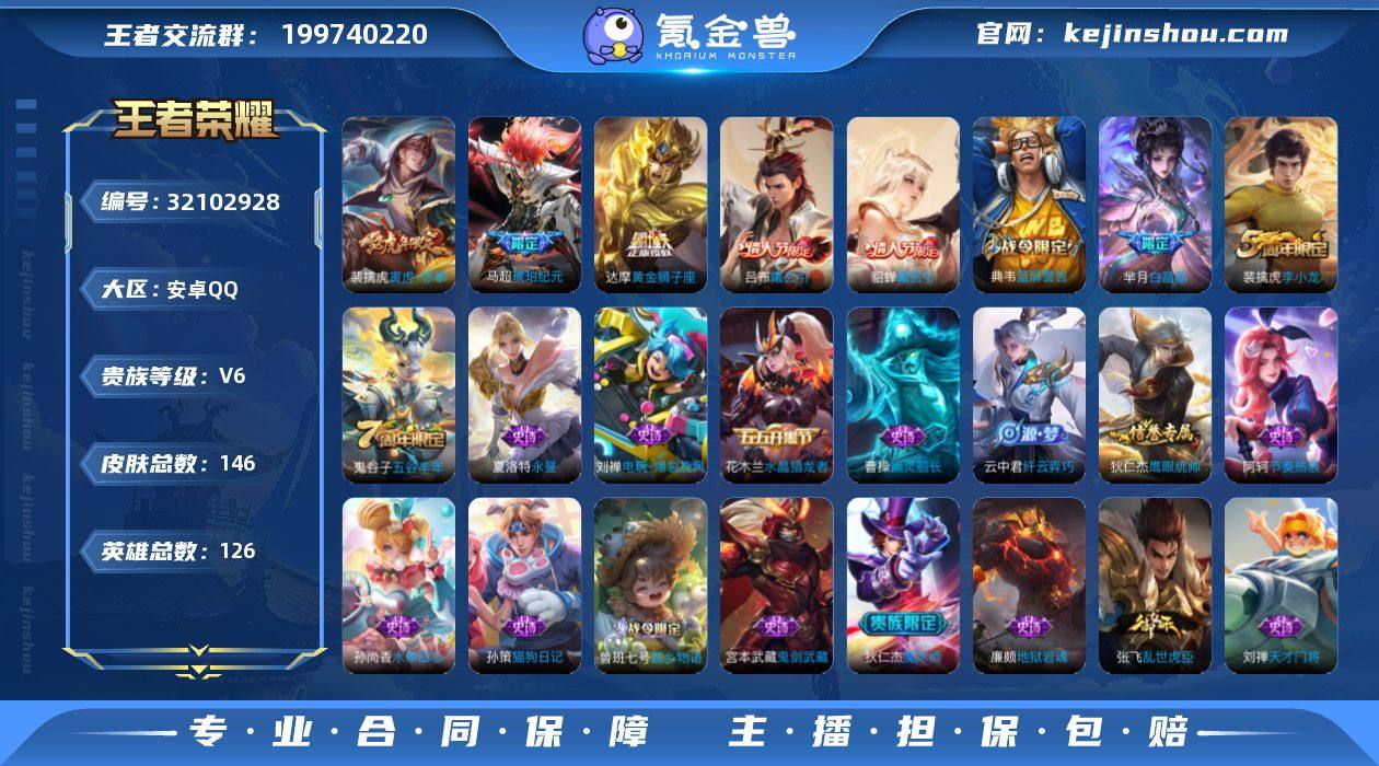 V6 5传说 146皮肤 126英雄 【5传说】达摩-黄金狮子座,裴擒虎-寅虎·赤拳,貂蝉-曦玄引,吕布-曦玄引,马超-琥珀纪元【23史诗】鬼谷子-五谷丰年,夏洛特-永昼,阿轲-节奏热浪,蔡文姬-舞动绿茵,曹操-幽灵船长,狄仁杰-魔术师,狄仁杰-鹰眼统帅,典韦-蓝屏警告,宫本武藏-鬼剑武藏,花木兰-水晶猎龙者,廉颇-地狱岩魂,刘禅-绅士熊喵,刘禅-天才门将,芈月-白晶晶,裴擒虎-李小龙,孙策-猫狗日记,孙尚香-水果甜心,王昭君-偶像歌手,云中君-纤云弄巧,张飞-乱世虎臣,赵云-皇家上将,刘禅-电玩·爆裂旋风,鲁班七号-蔬乡物语