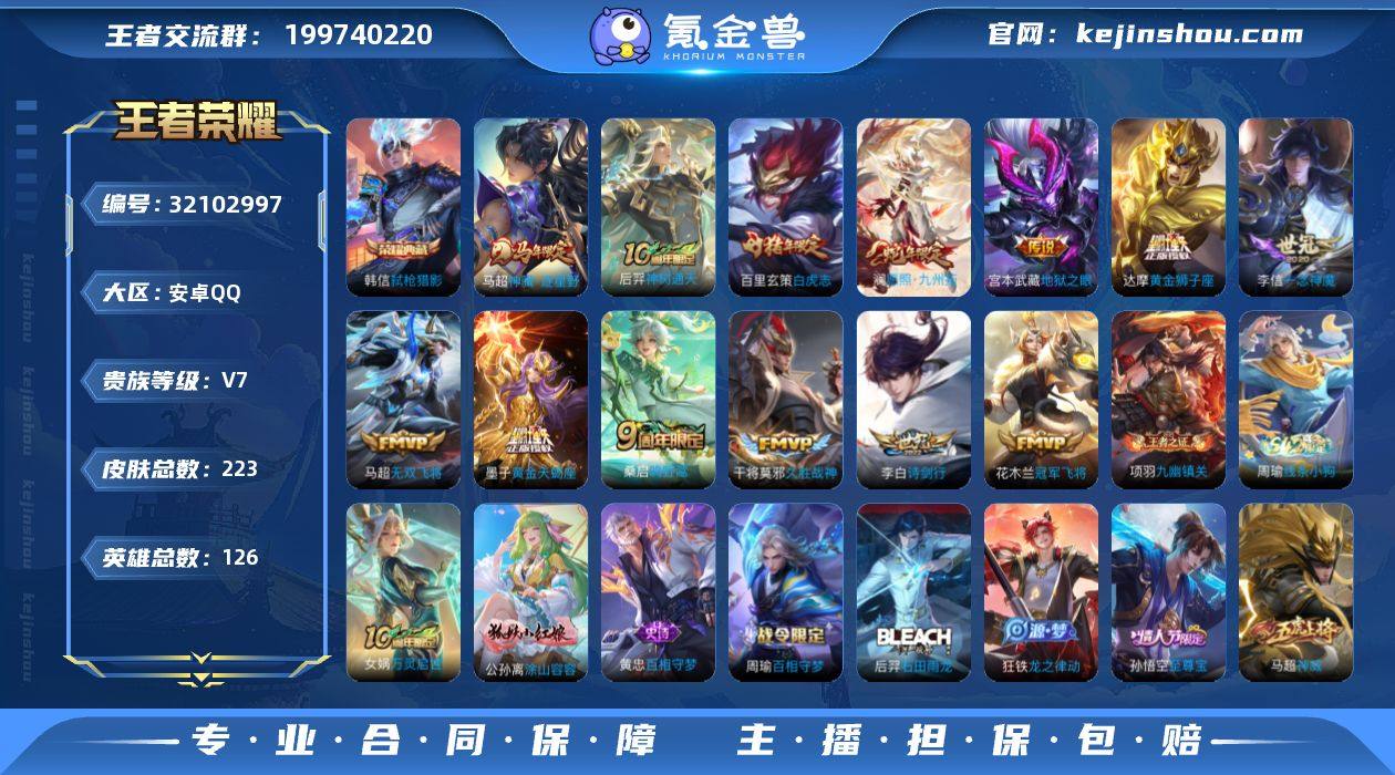实名: 可修改 贵族等级: V7 英雄数: 126 皮肤数: 223 荣耀水晶: 弑枪猎影 传说皮: 黄金狮子座,冠军飞将,久胜战神,一念神魔,地狱之眼,无双飞将,黄金天蝎座,神树通天,神骥·逐星野 限定皮: 李小龙,烈魂,辉光之辰,神威,美猴王,白虎志,至尊宝,五谷丰年,诗剑行,鸣野蒿,逐霄战戟,愿照·九州拓