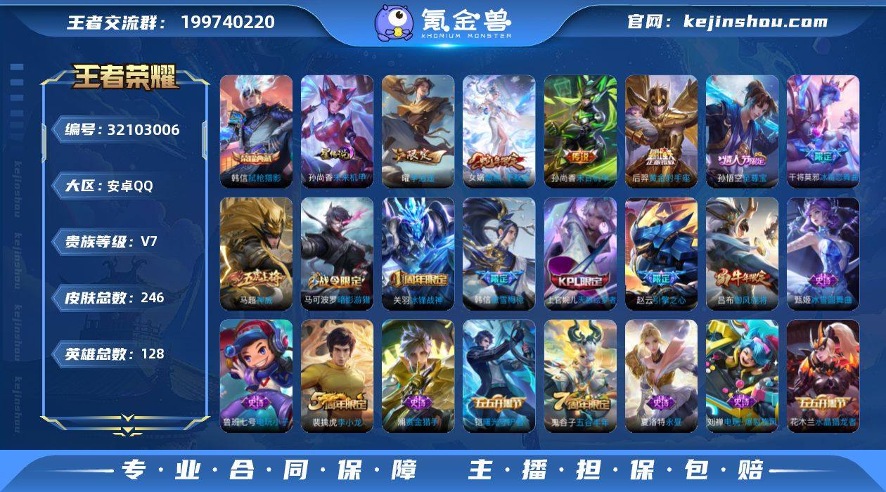V7 1典藏 5传说 1星元 246皮肤 128英雄 【1水晶】韩信-弑枪猎影【5传说】后羿-黄金射手座,孙尚香-末日机甲,曜-李逍遥,女娲-愿照·千秋盛【1星元】孙尚香-未来机甲【57史诗】鬼谷子-五谷丰年,赵云-未来纪元,澜-赏金猎手,夏洛特-永昼,阿轲-节奏热浪,安琪拉-心灵骇客,白起-星夜王子,百里守约-特工魅影,曹操-幽灵船长,蔡文姬-繁星吟游,程咬金-功夫厨神,妲己-女仆咖啡,妲己-魅力维加斯,狄仁杰-魔术师,狄仁杰-鹰眼统帅,貂蝉-圣诞恋歌,伽罗-天狼溯光者,干将莫邪-冰霜恋舞曲,宫本武藏-鬼剑武藏,关羽-冰锋战神,韩信-傲雪梅枪,花木兰-水晶猎龙者,黄忠-火炮绅士,镜-匿光追影者,铠-曙光守护者,兰陵王-暗隐猎兽者,李白-千年之狐,李元芳-逐浪之夏,李元芳-银河之约,廉颇-地狱岩魂,刘邦-德古拉伯爵,刘禅-天才门将,鲁班七号-电玩小子,鲁班七号-狮舞东方,吕布-御风骁将,马超-神威,马可波罗-暗影游猎,米莱狄-胡桃异想国,墨子-金属风暴,上官婉儿-梁祝,裴擒虎-李小龙,上官婉儿-天狼绘梦者,孙尚香-水果甜心,孙悟空-至尊宝,夏侯惇-乘风破浪,小乔-缤纷独角兽,雅典娜-冰冠公主,杨玉环-遇见飞天,嬴政-摇滚巨星,嬴政-白昼王子,赵云-皇家上将,赵云-引擎之心,甄姬-冰雪圆舞曲,甄姬-游园惊梦,戈娅-驭风魔法,刘禅-电玩·爆裂旋风,蒙犽-百解令