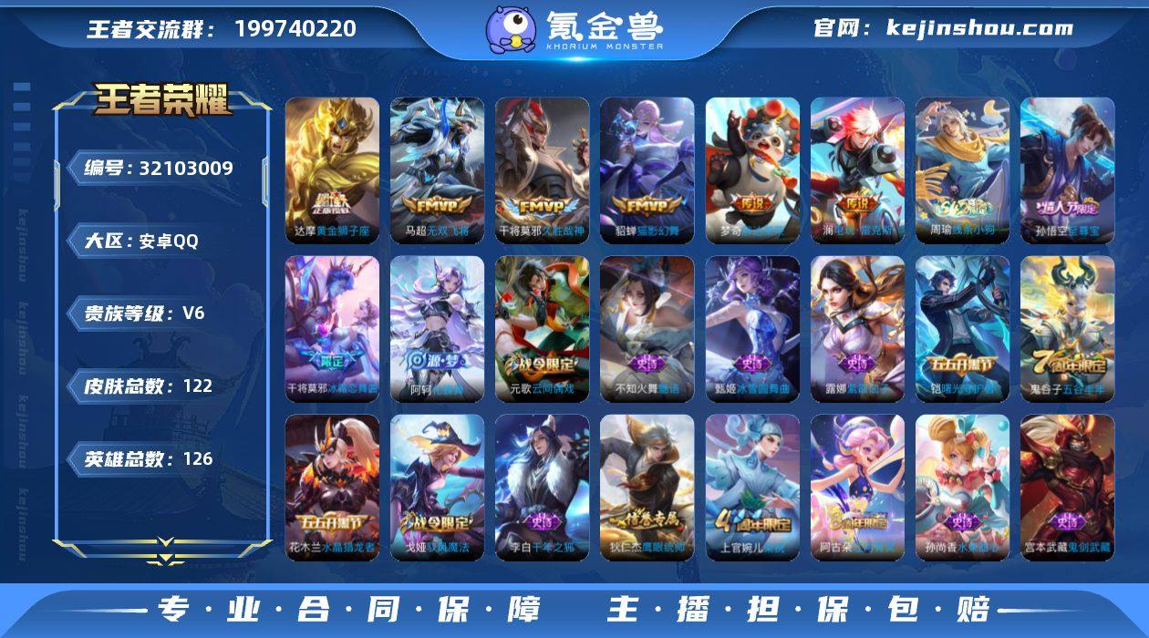 贵族等级: V6 英雄数: 126 皮肤数: 122 传说皮: 黄金狮子座,猫影幻舞,久胜战神,胖达荣荣,无双飞将,电玩·雷克斯 限定皮: 梁祝,冰霜恋舞曲,至尊宝,五谷丰年