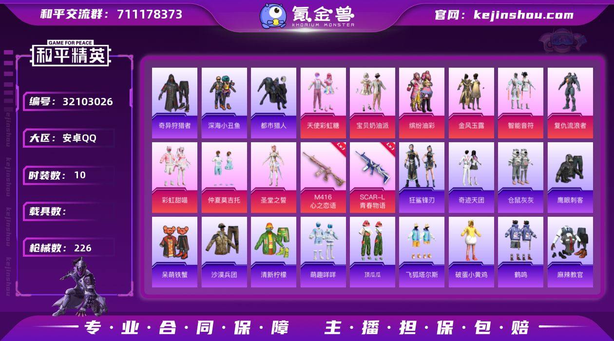 M1046721【公主号无敌战神框21高印记10粉装-8特效枪】安卓手Q-10粉装-8特效枪-169套装-226枪皮-21王牌印记-超级王牌6星-74841热力值【10粉装】缤纷油彩,宝贝奶油派,角色-异瞳寒姬,彩虹甜喵,金风玉露,天使彩虹糖,角色-复仇流浪者,智能音符,仲夏莫吉托,角色-圣堂之誓【8特效枪】M416-心之恋语[7级],AA12-G-萌骑幻想[1级],UMP45-萌骑冒险[1级],Mk14-福马献瑞[5级],PKM-萌骑夺宝[1级],SCAR-L-青春物语[7级],ACE32-萌骑漫游[1级],DP-28-豹影疾电[5级]【6稀有】NV战队服,深海小丑鱼,浪漫天命,奇异狩猎者,都市猎人,M24-奇异狩猎者【9飞行器】粉色滑翔尾迹,狂鲨锋刃飞行器,马上有福飞行器,异域银装飞行器,登顶巅峰飞行器,炫彩糖果飞行器,空岛之星尾迹,春暖花开飞行器,萌物绒绒飞行器【3头盔】百万伏特头盔,深海小丑鱼头盔,甜心宝贝头盔【3背包】甜心宝贝背包,深海小丑鱼背包,百万伏特背包【371其它衣服和枪皮】轻风白浪,异域银装,惊鸿侠骨,萌鸡速递,冷焰舞者,元气之梦,SS33特训,霓虹街区,香榭午后,传奇侦探,懵萌河马,竞技勇士朋克,玉兔迎春,长空猛禽,神气柴柴,SS35特训,炫彩糖果,鹤鸣,呆萌铁蟹,金鼠迎春,SS32特训,牛气满满,SS37特训,SS34特训,柠萌假日,薄荷蓝莓,街头潮人,SS22特训,青翼流星,飞行日记,猎梦纪元,鹰眼刺客,麻辣教官,蓝彩潮人,粉红小猪,浪漫樱花,白糯汤圆,SS28特训,SS24特训,果汁能量,幻世战舞者,耀粉歌者,SS20特训,SS7特训,SS5特训,阳光菠萝,SS21特训,SS11特训,飞狐塔尔斯,狂鲨锋刃,蓝色守护者,星光纪元,漫步者,快乐星愿,俏皮奶喵,SS8特训,冰爽海盐,特战装甲,绯格组合,竞技名士,粉团憨憨,擎苍青焰,甜梦熊熊,白色伏地魔,SS14特训,华灯初上,沙漠兵团,朱霞炽焰,清新柠檬,炽焰拳师,萌趣咩咩,坚韧舞者,人气偶像,顶瓜瓜,红釉青花,娇憨猪猪,福马献瑞,Alan Walker,马上来财,格斗专家,幻