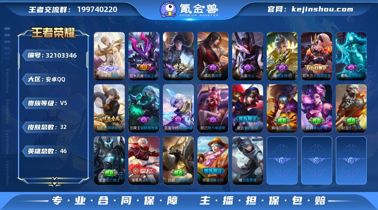 V5 1无双 3传说 32皮肤 46英雄 【1无双】孙悟空-无相【3传说】宫本武藏-地狱之眼,李信-一念神魔【10史诗】元歌-无心,澜-赏金猎手,曹操-幽灵船长,妲己-魅力维加斯,狄仁杰-鹰眼统帅,花木兰-水晶猎龙者,橘右京-修罗,兰陵王-暗隐猎兽者,赵云-皇家上将,百里守约-真我赫兹