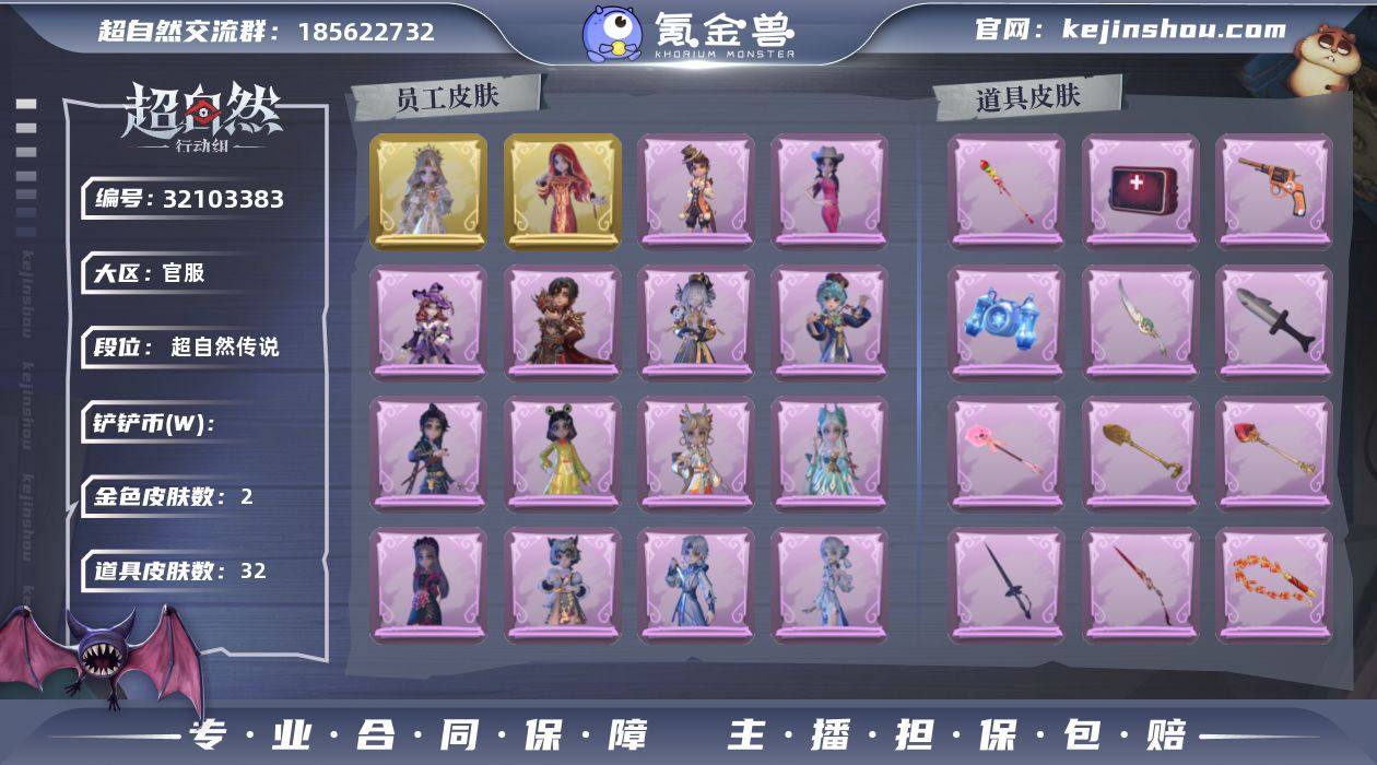 红色皮肤数量:0 金色皮肤数量:2 紫色皮肤数量:19 道具皮肤数量:32 圣光之谕,镜花辞 卖家说:全部梦居满级梦居回收物2300w+决版逍遥拜年卡,故宫全套,叶罗丽联X2,福宝已买3级,低价出(全天在线可验号)