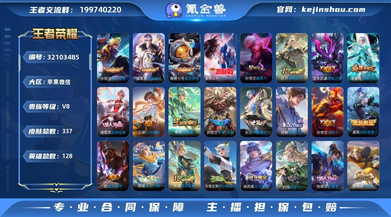 【高性价比·全息碎影·星空梦想·星域神启·江户川柯南·挚爱之约·淬星耀世·时雨天司·零号赤焰·武陵仙君·可二次】YXw16509-苹果WX-128英雄-337皮肤-23王者印记-300铭文-贵族积分6w【贵族8】【3典藏·1珍品·1星传说·12传说·1天幕·5按键】【因赛季更新游戏段付以上号为准!】 【荣耀典藏】:孙悟空全息碎影,鲁班七号星空梦想,诸葛亮星域神启 【珍品传说】:鲁班七号江户川柯南 【星元皮肤】:孙悟空幽冥火 【天幕】:共赏芳华天幕 【传说皮肤】:后羿神树通天,云缨幻光神枪,桑启鸣野蒿,孙策挚爱之约,赵云淬星耀世,诸葛亮时雨天司,铠绛天战甲,虞姬启明星使,孙悟空零号赤焰,诸葛亮武陵仙君,宫本武藏地狱之眼,孙悟空地狱火 【限定皮肤】:蒙犽顽岩魄,姜子牙天穹之誓,狄仁杰阴阳师,赵云皇家上将,赵云引擎之心,墨子神迹守卫,嬴政白昼王子,孙尚香蔷薇恋人,鲁班七号狮舞东方,鲁班七号乒乒小将,庄周高山流水,高渐离玩趣恶龙,阿轲迷踪丽影,白起夜都怪侠,芈月重明,吕布猎兽之王,吕布御风骁将,元歌云间偶戏,夏侯惇朔风刀,甄姬游园惊梦,曹操烛龙,典韦穷奇,马可波罗逐梦之星,狄仁杰魔术师,狄仁杰万华元夜,达摩沙漠行僧,项羽海滩派对,老夫子醍醐杖,老夫子航海奇遇记,关羽冰锋战神,程咬金演武夺筹,刘邦夺宝奇兵,韩信逐梦之影,韩信傲雪梅枪,兰陵王金庭之子,花木兰青春决赛季,花木兰默契交锋,亚瑟潮玩骑士王,孙悟空美猴王,孙悟空至尊宝,孙悟空大圣娶亲,孙悟空零号赤焰,孙悟空孙行者,牛魔御旌,后羿圣弓游侠,李元芳云中旅人,虞姬霸王别姬,虞姬启明星使,钟馗神迹守卫,钟馗驱傩正仪,杨玉环遇见飞天,干将莫邪胡桃夹子,干将莫邪真爱魔法,雅典娜单词大作战,雅典娜黎明之约,鬼谷子原初探秘者,鬼谷子五谷丰年,诸葛亮武陵仙君,诸葛亮时雨天司,铠青龙志,苏烈千军破阵,百里...