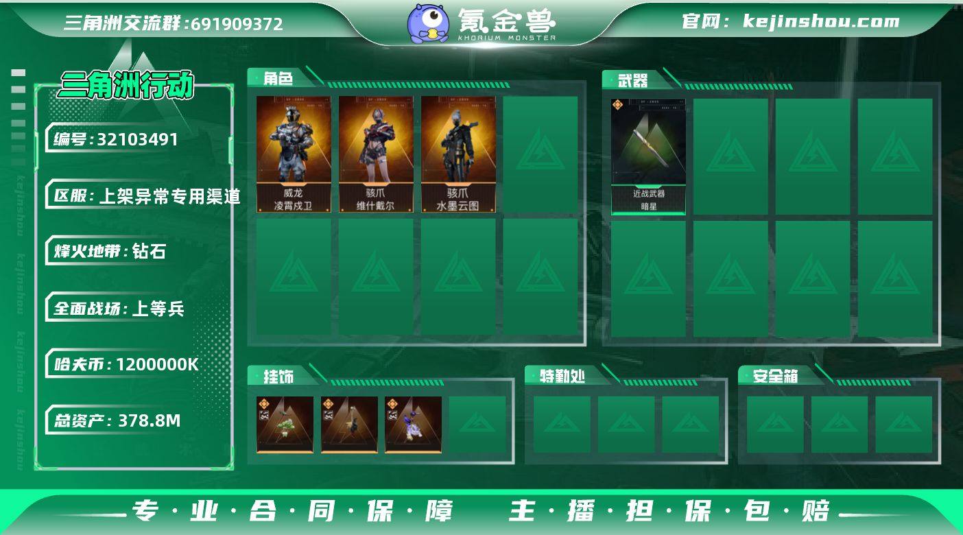 实名:不可二次实名 总资产:378.8M 哈夫币:1200000K 烽火地带段位:钻石 烽火地带等级:60 全面战场段位:上等兵 全面战场等级:60