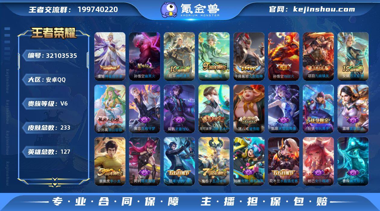 MCK627060 【虞姬典藏+久胜】 皮肤数量233 印记总数30 【V6】 【至尊星耀】 【暂时不可修改】 类型6 荣耀典藏1 星元皮肤1 传说4 史诗67 类型:男号,射手,上单,打野,辅助,中单; 荣耀典藏:虞姬_神鉴启示录; 星元皮肤:孙悟空_幽冥火; 传说:后羿_神树通天,孙悟空_地狱火,干将莫邪_久胜战神,桑启_鸣野蒿; 史诗:扁鹊_灵蛊蚀心,项羽_九幽镇关,女娲-万灵启世,公孙离_涂山容容,百相守梦-黄忠,李白_千年之狐,猪八戒_猪悟能,刘邦_德古拉伯爵,小乔_缤纷独角兽,白起_星夜王子,安琪拉_心灵骇客,张飞_乱世虎臣,嬴政_暗夜贵公子,伽罗_箭羽风息,百里玄策_原初追逐者,裴擒虎_李小龙,墨子_金属风暴,狄仁杰_鹰眼统帅,孙尚香_水果甜心,妲己_魅力维加斯,蒙恬_荣光圣徽,狄仁杰_魔术师,甄姬_游园惊梦,嬴政_优雅恋人,钟无艳_超时空战士,庄周_高山流水,牛魔_星界战将,孙膑_茶境仙,狂铁_电玩高手,蒙犽_顽岩魄,鬼谷子_五谷丰年,赵云_皇家上将,梦奇_顽趣,雅典娜_黎明之约,阿古朵_江河有灵,露娜_紫霞仙子,曹操_幽灵船长,貂蝉_圣诞恋歌,铠_曙光守护者,墨子_龙骑士,项羽_苍穹之光,阿珂_暗夜猫娘,廉颇_地狱岩魂,兰陵王_暗隐猎兽者,孙策_猫狗日记,妲己_女仆咖啡,马可波罗_山海玄木吟,诸葛亮_黄金分割率,甄姬_冰雪圆舞曲,百里守约_特工魅影,嬴政_摇滚巨星,吕布_末日机甲,吕布_圣诞狂欢,大乔_猫狗日记,刘禅_绅士熊喵,刘禅_天才门将,刘禅_电玩爆裂旋风,钟馗_乐园奇幻夜,李元芳_逐浪之夏,程咬金_功夫厨神,蔡文姬_舞动绿茵,赵云_未来纪元,亚瑟_心灵战警,花木兰_水晶猎龙者,宫本武藏_鬼剑武藏,阿珂_节奏热浪,夏侯惇_乘风破浪;