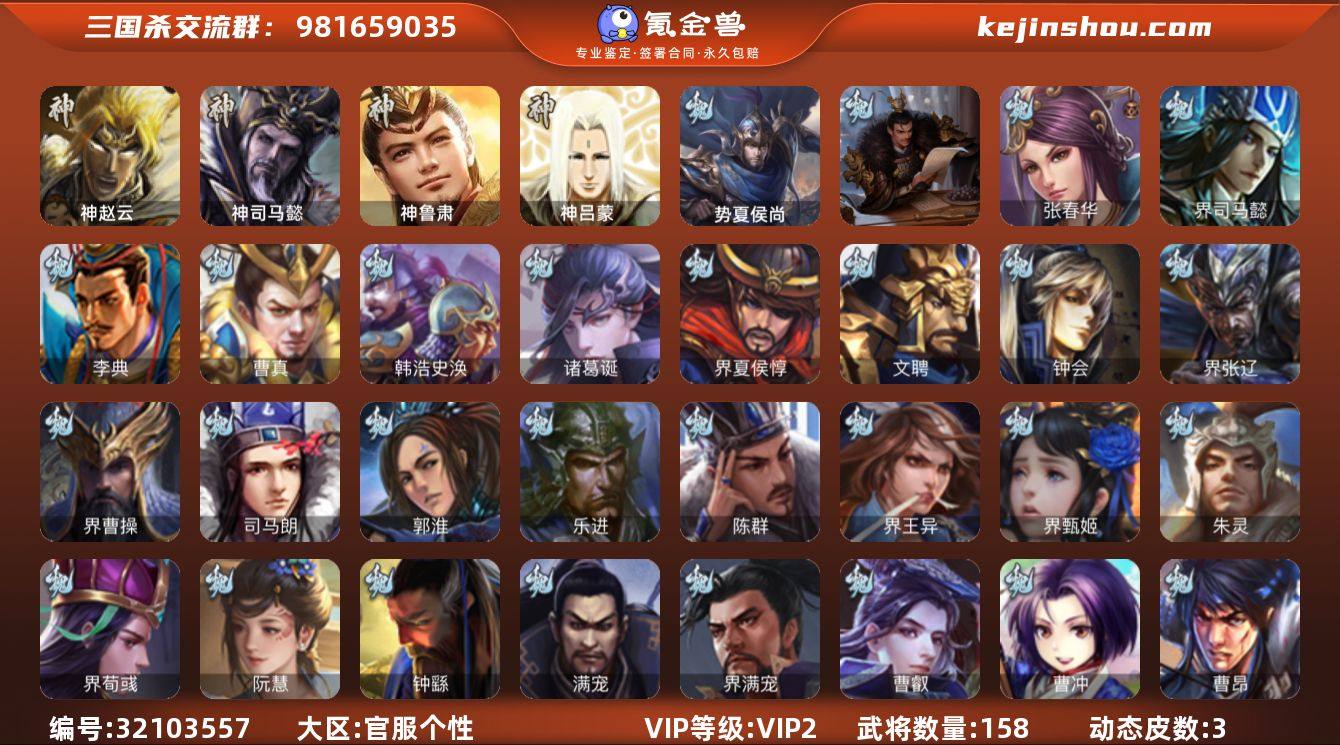 官阶:先锋将军;VIP等级:VIP2;史诗武将数量:5;动态皮肤数量:3;武将总数:158;史诗宝珠数量:0;将魂数量:1956;神将:3;魏国史诗武将:0;蜀国史诗武将:0;吴国史诗武将:2;群史诗武将:0 神赵云,神司马懿,神鲁肃,周处,吴景,神吕蒙,势夏侯尚,SP关羽,SP曹仁,SP蔡文姬,乐进,曹昂,诸葛诞,朱灵,文聘,SP姜维,张春华,钟会,曹冲,郭淮,满宠,界王异,界曹操,界司马懿,界夏侯惇,界张辽,李典,曹真,韩浩史涣,陈群,曹叡,钟繇,司马朗,界甄姬,界荀彧,界满宠,阮慧,关银屏,夏侯霸,马良,关兴张苞,廖化,界马岱,关平,刘封,界法正,界关兴张苞,界张飞,界赵云,界马超,吴懿,周仓,张松,马忠,界简雍,彭羕,谋张飞,诸葛瑾,孙鲁育,程普,韩当,潘璋马忠,虞翻,界甘宁,界黄盖,界周瑜,界大乔,界陆逊,孙鲁班,顾雍,界孙权,吕岱,孙邵,蒋钦,张布,孟达,友庞统,伏完,界袁术,SP赵云,张宝,伏皇后,李儒,华雄,袁术,界华佗,界吕布,蔡夫人,公孙渊,严白虎,刘繇,界刘表,王濬,势田丰,费祎-安民护祚(动态),关银屏-兔年春节(动态),陶谦-安民护祚(动态)