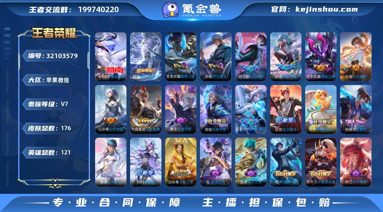 .3w小国司空震·1.1w金标韩信·金标百里守约·金标准万战公孙离·背包一水·怪盗基德·器灵落星盏·九山相柳·愿照山河定·落雪白狼·记忆之芯·至尊宝·可二次】w16526-苹果WX-121英雄-176皮肤-8王者印记-80铭文-贵族积分4w【贵族7】【2珍品·2星传说·8传说·10按键】【因赛季更新游戏段付以上号为准!】 【英雄全皮】:孙权全皮,苍全皮,亚连全皮,空空儿全皮,影全皮 【珍品传说】:马可波罗怪盗基德,嫦娥器灵落星盏 【小国标】:小国标司空震 【星元皮肤】:刘备时之思念,宫本武藏幽冥之眼 【传说皮肤】:司马懿九山相柳,司空震愿照山河定,云缨幻光神枪,桑启鸣野蒿,亚连落雪白狼,公孙离记忆之芯,干将莫邪久胜战神,宫本武藏地狱之眼 【限定皮肤】:蒙犽顽岩魄,蔡文姬夏日便利店,大乔绒语心约,虞姬夏日便利店,姜子牙天穹之誓,杨戬破阵退雄兵,狄仁杰阴阳师,赵云皇家上将,元歌云间偶戏,狄仁杰魔术师,项羽海滩派对,孙悟空至尊宝,李元芳银河之约,杨玉环遇见飞天,梦奇顽趣,公孙离玉兔公主,蒙犽狂想玩偶喵,阿古朵江河有灵,张良古海寻踪,姬小满妄想食味,亚连落雪白狼,刘邦剑破天穹,程咬金群星魔术团,镜青焰无极,项羽苍威无极,海诺心动手记,刘备异域游侠,芈月浮光幕影,周瑜熔金海岸 【年限皮肤】:司空震愿照山河定 【赛季限定】:张良古海寻踪,刘邦剑破天穹,姜子牙天穹之誓,东皇太一噬灭天穹,太乙真人谧流熔炉,钟馗虚灵犬护,甄姬逆浪荇歌,亚瑟荣光之誓,梦奇顽趣,牛魔星界战将,项羽九幽镇关 【战令限定】:李元芳银河之约,蒙犽狂想玩偶喵,元歌云间偶戏,镜青焰无极,项羽苍威无极,蔡文姬夏日便利店,虞姬夏日便利店,亚连破空之剑,孙悟空神迹守卫,百里守约百相守梦,老夫子百相守梦,孙膑茶境仙,马超访茗客,刘禅鸭鸭历险记,沈梦溪鸭鸭历险记,周瑜百相守梦,孙策百相守梦 【史...