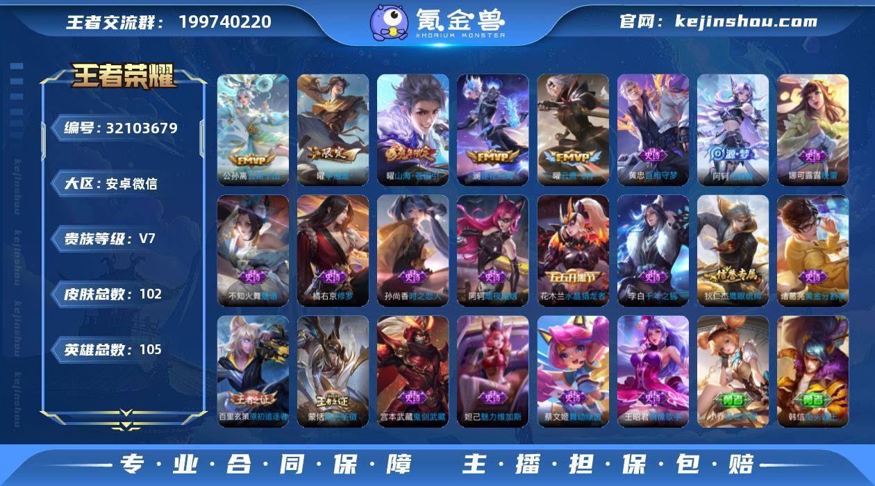 ·孙尚香异界灵契·李逍遥·时雨天司·云诺千山·愿照九州拓·绯月行·逐花归海·山海苍雷引·枫霜尽·云鹰飞将·山海玄木吟·朱雀志·可二次】w16551-安卓WX-105英雄-102皮肤-10王者印记-120铭文-贵族积分2w【贵族7】【·11传说·6按键】【因赛季更新游戏段付以上号为准!】 【英雄全皮】:橘右京全皮 【传说皮肤】:公孙离云诺千山,澜愿照九州拓,澜逐花归海,曜山海苍雷引,不知火舞绯月行,橘右京枫霜尽,马可波罗深海之息,孙尚香异界灵契,曜李逍遥 ,诸葛亮时雨天司,曜云鹰飞将 【限定皮肤】:狄仁杰阴阳师,赵云皇家上将,嬴政优雅恋人,孙尚香异界灵契,马可波罗深海之息,马可波罗山海玄木吟,狄仁杰魔术师,达摩沙漠行僧,项羽海滩派对,兰陵王金庭之子,不知火舞绯月行,橘右京枫霜尽,孙悟空孙行者,李元芳云中旅人,鬼谷子五谷丰年,诸葛亮时雨天司,百里玄策原初追逐者,百里守约朱雀志,梦奇顽趣,沈梦溪大漠名商,裴擒虎擒涛扼浪,嫦娥暖冬兔眠,曜李逍遥 ,曜山海苍雷引,鲁班大师探海日志,桑启海盐诗旅,暃星界游侠,张良古海寻踪,蒙恬荣光圣徽 【年限皮肤】:百里守约朱雀志,诸葛亮时雨天司,曜山海苍雷引,马可波罗山海玄木吟,澜愿照九州拓 【赛季限定】:达摩沙漠行僧,兰陵王金庭之子,沈梦溪大漠名商,李元芳云中旅人,桑启海盐诗旅,裴擒虎擒涛扼浪,鲁班大师探海日志,张良古海寻踪,太乙真人谧流熔炉,钟馗虚灵犬护,甄姬逆浪荇歌,百里玄策原初追逐者,梦奇顽趣,蒙恬荣光圣徽,项羽九幽镇关 【战令限定】:暃星界游侠,嫦娥暖冬兔眠,周瑜线条小狗 【史诗皮肤】:阿轲暗夜猫娘,赵云皇家上将,王昭君偶像歌手,狄仁杰魔术师,宫本武藏鬼剑武藏,嬴政优雅恋人,妲己魅力维加斯,李白千年之狐,花木兰水晶猎龙者,诸葛亮黄金分割率,蔡文姬舞动绿茵,阿轲节奏热浪,百里守约朱雀志,狄仁杰鹰眼统...
