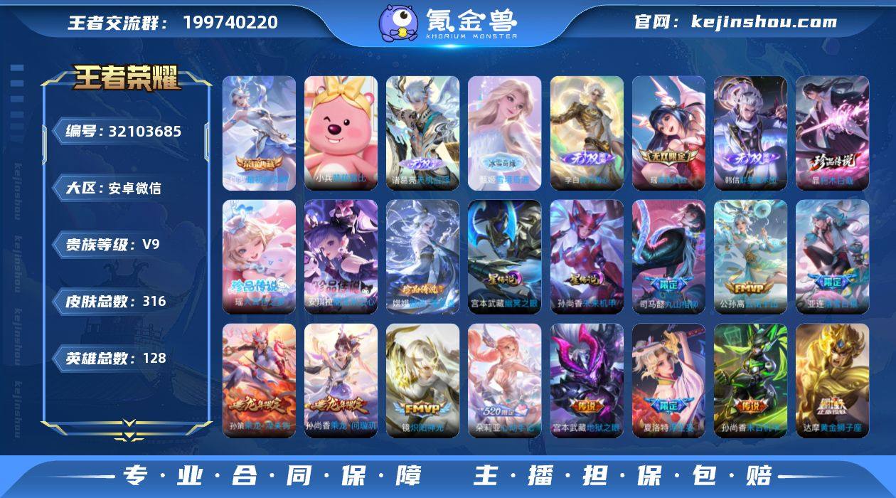 无双馥梦繁花·7无双·无相·神罪·天机白泽·雪境奇遇·群星魔术团·碎月剑心·瑶真我赫兹·最初的交响·朽木白哉·酷洛米之心·大耳狗之梦·器灵落星盏·镜破晓神光·雪境奇遇天幕·诡秘之主·九山相柳·云诺千山·霜北刀·朵莉亚心动手记·落雪白狼·满龙年限定·大乔时之奇旅·妄想实况·浮生妄·寅虎赤拳·至尊宝·可二次】w16576-安卓WX-128英雄-316皮肤-12王者印记-180铭文-贵族积分14w【贵族9】【1典藏·1珍品无双·7无双·4珍品·3星传说·32传说·1天幕·43按键】【因赛季更新游戏段付以上号为准!】 【英雄全皮】:元歌全皮,孙权全皮,大司命全皮,戈娅全皮,空空儿全皮,影全皮,少司缘全皮 【荣耀典藏】:伽罗最初的交响 【珍品无双】:貂蝉馥梦繁花 【无双皮肤】:孙悟空无相,铠神罪,诸葛亮天机白泽,甄姬雪境奇遇,韩信群星魔术团,李白碎月剑心,瑶真我赫兹 【珍品传说】:暃朽木白哉,安琪拉酷洛米之心,瑶大耳狗之梦,嫦娥器灵落星盏 【星元皮肤】:镜破晓神光,孙尚香未来机甲,宫本武藏幽冥之眼 【天幕】:雪境奇遇天幕 【传说皮肤】:杨戬纵目迁山,后羿神树通天,干将莫邪千山共赴,元歌诡秘之主,大司命死亡执政官,司马懿九山相柳,公孙离云诺千山,杨玉环星之鸣奏,澜愿照九州拓,虞姬愿照岁时盈,桑启鸣野蒿,夏侯惇霜北刀,朵莉亚心动手记,亚连落雪白狼,孙尚香乘龙问璇玑,孙策乘龙淬吴钩,赵云乘龙铭钟鼎,大乔时之奇旅,马可波罗妄想实况,夏洛特浮生妄,花木兰燃星之曲,马超无双飞将,裴擒虎寅虎赤拳,西施游龙清影,镜炽阳神光,虞姬启明星使,李信一念神魔,达摩黄金狮子座,后羿黄金射手座,孙尚香末日机甲,宫本武藏地狱之眼,孙悟空地狱火 【限定皮肤】:夏侯惇霜北刀,蒙犽顽岩魄,蔡文姬夏日便利店,虞姬夏日便利店,姜子牙天穹之誓,杨戬破阵退雄兵,狄仁杰阴阳师,赵云皇家上将,妲己时之奇旅,孙膑寅虎...