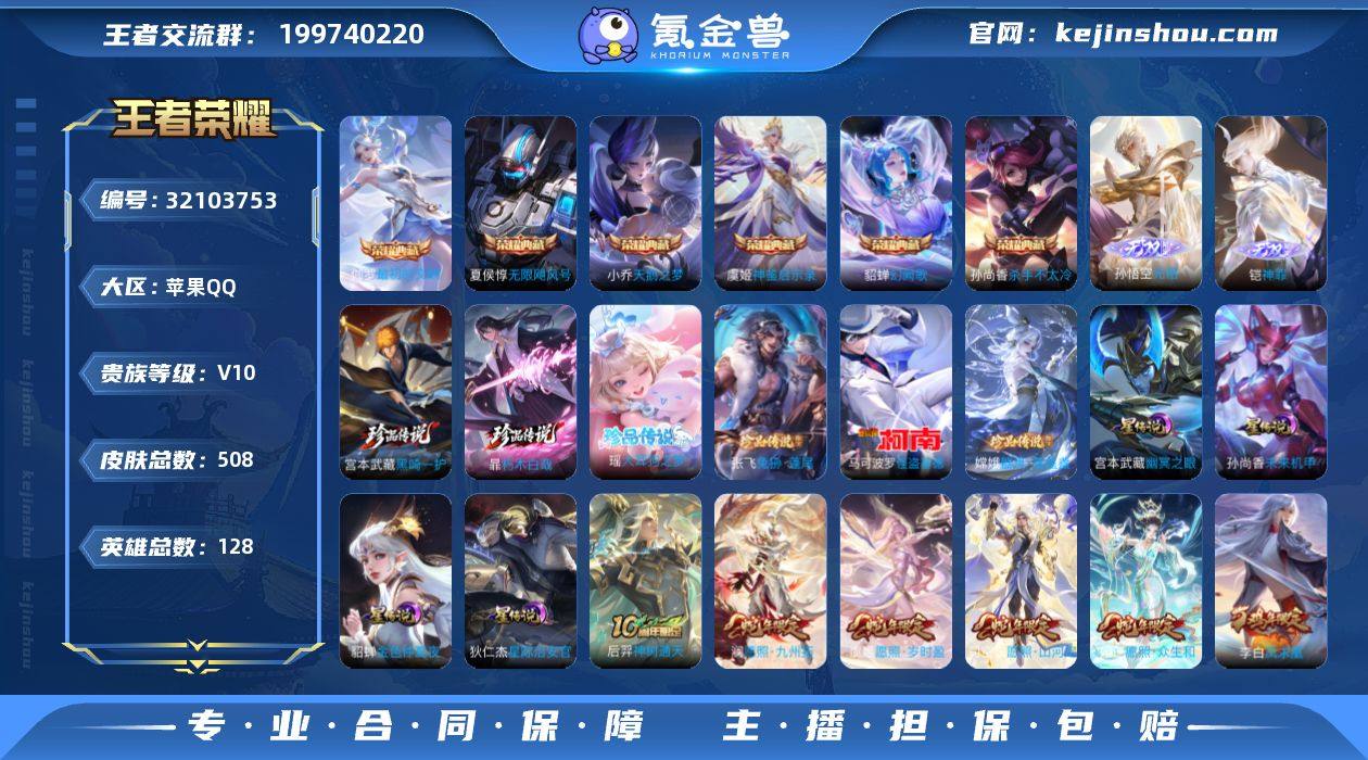 苹果Q-V10-最强王者段位-128英雄-508皮肤-7典藏皮肤-3无双-7珍品传说-40传说-160史诗【英雄全皮】:刘禅全皮,刘邦全皮,孙权全皮,钟馗全皮,鬼谷子全皮,狂铁全皮,猪八戒全皮,敖隐全皮,蒙恬全皮,暃全皮,戈娅全皮,空空儿全皮,影全皮【荣耀典藏】:夏侯惇无限飓风号,小乔天鹅之梦,孙尚香杀手不太冷,貂蝉幻阙歌,虞姬神鉴启示录,伽罗最初的交响,安琪拉颠倒童话魔镜【无双皮肤】:李信问心剑,孙悟空无相,铠神罪【珍品传说】:伽罗沧流箭,宫本武藏黑崎一护,暃朽木白哉,瑶大耳狗之梦,张飞兔狲蓬尾,嫦娥器灵落星盏,马可波罗怪盗基德【传说皮肤】:云缨神骥越千峰,狄仁杰神骥赴朔漠,貂蝉神骥聚万邦,马超神骥逐星野,后羿神树通天,司空震愿照山河定,女娲愿照千秋盛,妲己愿照众生和,澜愿照九州拓,蔡文姬愿照福禄聚,虞姬愿照岁时盈,云缨幻光神枪,王昭君映山客,桑启鸣野蒿,庄周牧神诗旅,夏侯惇霜北刀,艾琳觅芳踪,吕布怒海麟威,不知火舞绯月行,裴擒虎寅虎赤拳,鲁班七号寅虎瑞焰,孙尚香异界灵契,周瑜音你心动,小乔音你心动,诸葛亮时雨天司,铠绛天战甲,虞姬启明星使,刘备时之恋人,张良黄金白羊座,干将莫邪久胜战神,虞姬云霓雀翎,梦奇胖达荣荣,后羿黄金射手座,杨戬永曜之星,貂蝉仲夏夜之梦,李白凤求凰,孙尚香末日机甲,宫本武藏地狱之眼,武则天海洋之心,狄仁杰超时空战士【限定皮肤】:白起狰,夏侯惇霜北刀,暃埋骨钱,蔡文姬夏日便利店,大乔绒语心约,虞姬夏日便利店,姜子牙天穹之誓,杨戬破阵退雄兵,李白谪仙醉月,狄仁杰阴阳师,虞姬凯尔特女王,廉颇寅虎御盾,赵云皇家上将,赵云引擎之心,赵云龙胆,墨子神迹守卫,墨子降魔,嬴政白昼王子,孙尚香蔷薇恋人,孙尚香异界灵契,鲁班七号狮舞东方,鲁班七号寅虎瑞焰,庄周高山流水,高渐离玩趣恶龙,阿轲迷踪丽...