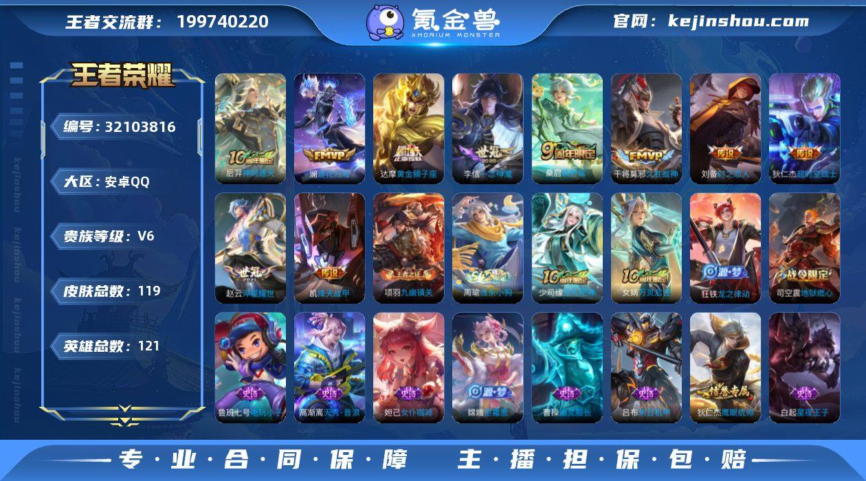 安卓Q-V6-最强王者段位-121英雄-119皮肤-10传说-28史诗【英雄全皮】:孙权全皮【传说皮肤】:后羿神树通天,桑启鸣野蒿,澜逐花归海,赵云淬星耀世,铠绛天战甲,李信一念神魔,刘备时之恋人,干将莫邪久胜战神,达摩黄金狮子座,狄仁杰超时空战士【限定皮肤】:姜子牙天穹之誓,狄仁杰阴阳师,赵云皇家上将,高渐离玩趣恶龙,狄仁杰魔术师,项羽海滩派对,上官婉儿梁祝,嫦娥拒霜思,鲁班大师探海日志,艾琳流音漫舞,司空震地狱燃心,阿古朵江河有灵,张良古海寻踪,蒙犽百解令,鬼谷子天穹祈灯,沈梦溪龙舞盛年,刘邦剑破天穹,周瑜熔金海岸【赛季限定】:鲁班大师探海日志,张良古海寻踪,鬼谷子天穹祈灯,刘邦剑破天穹,姜子牙天穹之誓,太乙真人谧流熔炉,钟馗虚灵犬护,甄姬逆浪荇歌,亚瑟荣光之誓,项羽九幽镇关【战令限定】:司空震地狱燃心,艾琳流音漫舞,周瑜线条小狗【史诗皮肤】:周瑜线条小狗,项羽九幽镇关,少司缘巫礼祀神,女娲万灵启世,狂铁龙之律动,蒙犽百解令,阿古朵江河有灵,司空震地狱燃心,高渐离天秀音浪,嫦娥拒霜思,上官婉儿梁祝,狄仁杰鹰眼统帅,孙策猫狗日记,阿轲节奏热浪,白起星夜王子,蔡文姬舞动绿茵,百里守约特工魅影,诸葛亮黄金分割率,兰陵王暗隐猎兽者,吕布末日机甲,曹操幽灵船长,妲己女仆咖啡,妲己魅力维加斯,嬴政摇滚巨星,孙尚香水果甜心,狄仁杰魔术师,貂蝉圣诞恋歌,赵云皇家上将,鲁班七号电玩小子【其他皮肤】:蒙恬苍云破阵,安琪拉糖果风暴,艾琳鹤鸣心笺,孙权径山谋武,张良罗小黑战记,亚瑟荣光之誓,哪吒罗小黑战记,桑启青衿临川,莱西奥踏浪烽翎,庄周锦麟游梦,甄姬逆浪荇歌,白起死霸装,露娜命运加冕,阿古朵布丁狗之约,钟馗虚灵犬护,戈娅玫蓝誓约,典韦铁骨偃魂,太乙真人谧流熔炉,苍苍林狼骑,周瑜熔金海岸,姜子牙天穹之誓,大司命...