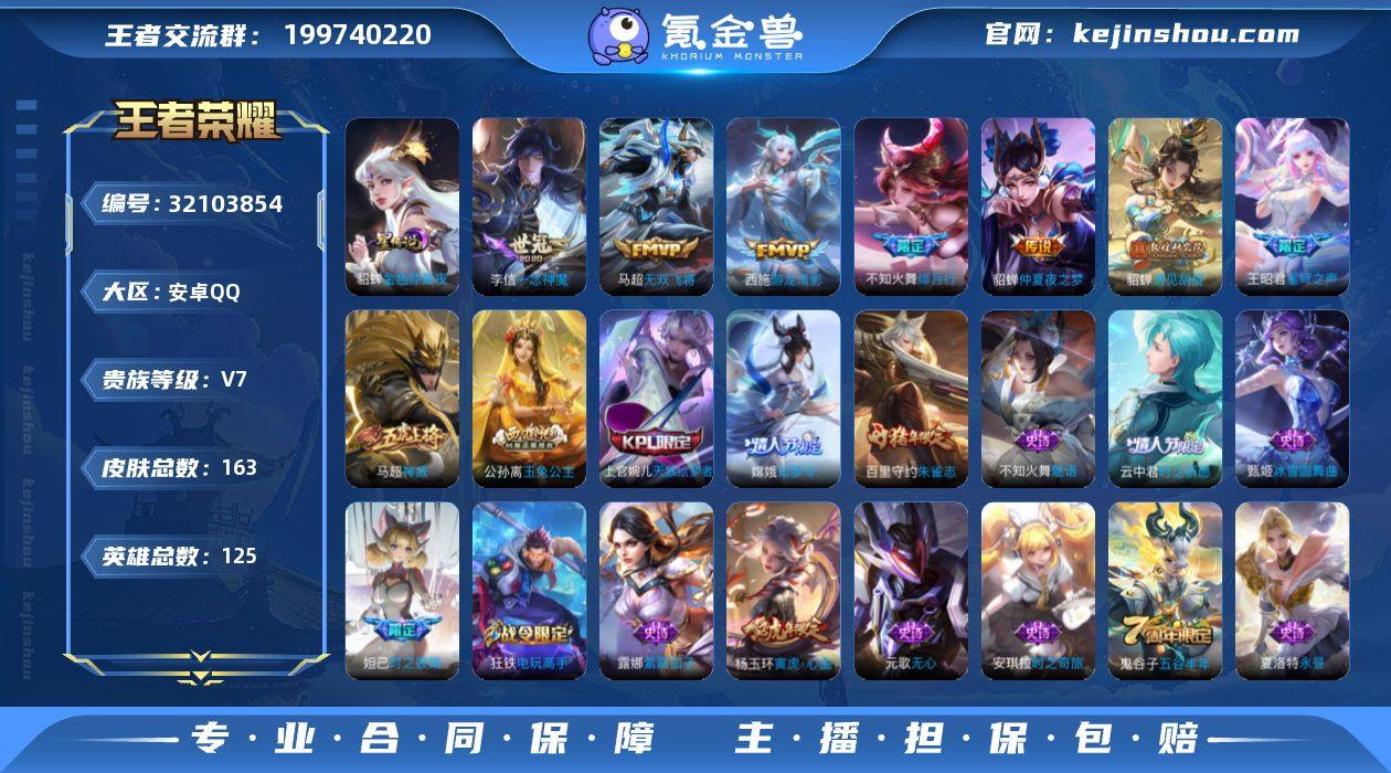 安卓Q-V7-荣耀黄金II段位-125英雄-163皮肤-7传说-49史诗【传说皮肤】:不知火舞绯月行,王昭君星穹之声,马超无双飞将,貂蝉遇见胡旋,西施游龙清影,李信一念神魔,貂蝉仲夏夜之梦【限定皮肤】:狄仁杰阴阳师,赵云皇家上将,妲己时之彼端,孙尚香蔷薇恋人,钟无艳超时空战士,芈月幻夜卜梦,元歌无心,夏侯惇朔风刀,甄姬落雪兰心,狄仁杰魔术师,狄仁杰万华元夜,达摩沙漠行僧,项羽海滩派对,老夫子醍醐杖,貂蝉遇见胡旋,程咬金演武夺筹,王昭君午后时光,王昭君星穹之声,兰陵王金庭之子,不知火舞绯月行,李元芳银河之约,李元芳云中旅人,钟馗驱傩正仪,杨玉环遇见飞天,杨玉环寅虎心曲,雅典娜黎明之约,蔡文姬繁星吟游,鬼谷子原初探秘者,鬼谷子五谷丰年,黄忠火炮绅士,苏烈千军破阵,百里守约朱雀志,弈星混沌棋,梦奇顽趣,公孙离玉兔公主,沈梦溪星空之诺,沈梦溪大漠名商,明世隐疑决卦,裴擒虎擒涛扼浪,狂铁电玩高手,云中君时之祈愿,伽罗天狼溯光者,盾山御銮,上官婉儿梁祝,上官婉儿天狼绘梦者,上官婉儿神器万象笔,嫦娥如梦令,嫦娥拒霜思,嫦娥暖冬兔眠,鲁班大师探海日志,桑启海盐诗旅,暃星界游侠,阿古朵江河有灵,张良古海寻踪,蒙犽百解令,鬼谷子天穹祈灯,刘邦剑破天穹,程咬金群星魔术团,周瑜熔金海岸【年限皮肤】:百里守约朱雀志,杨玉环寅虎心曲【赛季限定】:盾山御銮,夏侯惇朔风刀,弈星混沌棋,明世隐疑决卦,老夫子醍醐杖,鬼谷子原初探秘者,狄仁杰万华元夜,程咬金演武夺筹,钟馗驱傩正仪,苏烈千军破阵,达摩沙漠行僧,兰陵王金庭之子,沈梦溪大漠名商,李元芳云中旅人,桑启海盐诗旅,裴擒虎擒涛扼浪,鲁班大师探海日志,张良古海寻踪,鬼谷子天穹祈灯,刘邦剑破天穹,雅典娜黎明之约,梦奇顽趣【战令限定】:李元芳银河之约,沈梦溪星空之诺,黄忠火炮绅士,芈月...