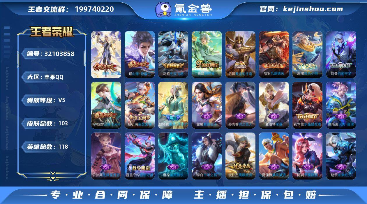 苹果Q-V5-最强王者段位-118英雄-103皮肤-6传说-33史诗【英雄全皮】:孙权全皮,敖隐全皮【传说皮肤】:狄仁杰神骥赴朔漠,司空震愿照山河定,桑启鸣野蒿,曜山海苍雷引,马超无双飞将,后羿黄金射手座【限定皮肤】:狄仁杰阴阳师,赵云皇家上将,马可波罗山海玄木吟,项羽海滩派对,刘备百相守梦,李元芳云中旅人,裴擒虎擒涛扼浪,曜山海苍雷引,鲁班大师探海日志,桑启海盐诗旅,张良古海寻踪,蒙恬荣光圣徽,姬小满妄想食味,刘邦剑破天穹,周瑜熔金海岸【年限皮肤】:曜山海苍雷引,马可波罗山海玄木吟,司空震愿照山河定【赛季限定】:李元芳云中旅人,桑启海盐诗旅,裴擒虎擒涛扼浪,鲁班大师探海日志,张良古海寻踪,刘邦剑破天穹,东皇太一噬灭天穹,太乙真人谧流熔炉,亚瑟荣光之誓,蒙恬荣光圣徽,项羽九幽镇关【战令限定】:百里守约百相守梦,老夫子百相守梦,周瑜线条小狗【史诗皮肤】:明世隐百晓客,周瑜线条小狗,项羽九幽镇关,赵怀真器灵浮梦炉,百里守约百相守梦,姬小满妄想食味,蒙恬荣光圣徽,百里守约真我赫兹,刘备百相守梦,马可波罗山海玄木吟,高渐离天秀音浪,夏洛特永昼,孙尚香时之恋人,公孙离无限星赏官,狄仁杰鹰眼统帅,阿轲节奏热浪,程咬金功夫厨神,李元芳逐浪之夏,兰陵王暗隐猎兽者,夏侯惇乘风破浪,花木兰水晶猎龙者,李白千年之狐,曹操幽灵船长,刘禅绅士熊喵,妲己魅力维加斯,嬴政摇滚巨星,孙尚香水果甜心,宫本武藏鬼剑武藏,廉颇地狱岩魂,王昭君偶像歌手,貂蝉圣诞恋歌,赵云未来纪元,赵云皇家上将,露娜紫霞仙子【其他皮肤】:鲁班七号班班快跑,虞姬溯影追猎,蚩奼极光幻客,艾琳鹤鸣心笺,孙权径山谋武,亚瑟荣光之誓,露娜命运加冕,明世隐景韶洛都,西施雪境奇遇,典韦铁骨偃魂,太乙真人谧流熔炉,苍苍林狼骑,干将莫邪雾都夜雨,老夫子百相守梦,东皇太...