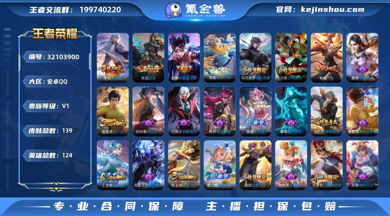 安卓Q-V1-永恒钻石II段位-124英雄-139皮肤-3传说-32史诗【传说皮肤】:关羽武圣,貂蝉仲夏夜之梦,李白凤求凰【限定皮肤】:狄仁杰阴阳师,赵云皇家上将,嬴政白昼王子,鲁班七号狮舞东方,庄周高山流水,芈月重明,吕布猎兽之王,周瑜赤莲之焰,元歌云间偶戏,夏侯惇朔风刀,典韦穷奇,马可波罗暗影游猎,狄仁杰魔术师,狄仁杰万华元夜,达摩星际陆战队,项羽海滩派对,老夫子醍醐杖,关羽武圣,程咬金演武夺筹,韩信飞衡,兰陵王驯魔猎人,亚瑟潮玩骑士王,牛魔御旌,李元芳银河之约,钟馗神迹守卫,钟馗驱傩正仪,杨玉环遇见飞天,雅典娜单词大作战,蔡文姬繁星吟游,鬼谷子原初探秘者,苏烈千军破阵,弈星混沌棋,沈梦溪星空之诺,明世隐疑决卦,裴擒虎李小龙,狂铁御狮,米莱狄御霄,米莱狄胡桃异想国,盾山御銮,猪八戒西部大镖客,上官婉儿梁祝,嫦娥拒霜思,蒙犽狂想玩偶喵【年限皮肤】:李白凤求凰,韩信飞衡【赛季限定】:芈月重明,典韦穷奇,狂铁御狮,米莱狄御霄,牛魔御旌,盾山御銮,夏侯惇朔风刀,弈星混沌棋,明世隐疑决卦,老夫子醍醐杖,鬼谷子原初探秘者,狄仁杰万华元夜,程咬金演武夺筹,钟馗驱傩正仪,苏烈千军破阵【战令限定】:嬴政白昼王子,吕布猎兽之王,鲁班七号狮舞东方,钟馗神迹守卫,兰陵王驯魔猎人,周瑜赤莲之焰,李元芳银河之约,沈梦溪星空之诺,马可波罗暗影游猎,猪八戒西部大镖客,蒙犽狂想玩偶喵,雅典娜单词大作战,元歌云间偶戏,亚瑟潮玩骑士王,米莱狄胡桃异想国,达摩星际陆战队,周瑜线条小狗【史诗皮肤】:周瑜线条小狗,嫦娥拒霜思,庄周高山流水,米莱狄胡桃异想国,元歌云间偶戏,裴擒虎李小龙,蒙犽狂想玩偶喵,马可波罗暗影游猎,孙尚香时之恋人,韩信飞衡,李元芳银河之约,蔡文姬繁星吟游,上官婉儿梁祝,兰陵王驯魔猎人,狄仁杰鹰眼统帅,鲁班七号狮舞东...
