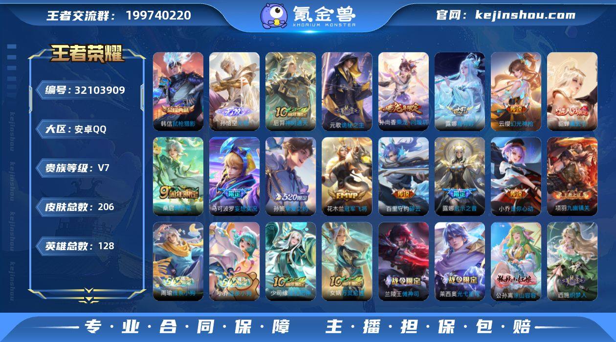安卓Q-V7-最强王者段位-128英雄-206皮肤-1典藏皮肤-1无双-1珍品传说-15传说-60史诗【英雄全皮】:露娜全皮,孙权全皮,敖隐全皮,海诺全皮【荣耀典藏】:韩信弑枪猎影【无双皮肤】:孙悟空无相【珍品传说】:伽罗沧流箭【传说皮肤】:狄仁杰神骥赴朔漠,貂蝉神骥聚万邦,后羿神树通天,元歌诡秘之主,云缨幻光神枪,桑启鸣野蒿,貂蝉曦玄引,孙尚香乘龙问璇玑,露娜霜月吟,马可波罗妄想实况,百里守约碎云,孙策挚爱之约,露娜启示之音,小乔音你心动,花木兰冠军飞将【限定皮肤】:姜子牙天穹之誓,狄仁杰阴阳师,赵云皇家上将,妲己时之彼端,元歌无心,马可波罗妄想实况,狄仁杰魔术师,达摩沙漠行僧,项羽海滩派对,露娜一生所爱,露娜启示之音,兰陵王金庭之子,牛魔御旌,钟馗驱傩正仪,鬼谷子原初探秘者,百里玄策原初追逐者,弈星混沌棋,沈梦溪大漠名商,明世隐疑决卦,裴擒虎擒涛扼浪,盾山御銮,孙策挚爱之约,嫦娥拒霜思,西施玲珑珍味,鲁班大师探海日志,桑启海盐诗旅,张良古海寻踪,蒙犽百解令,鬼谷子天穹祈灯,孙尚香乘龙问璇玑,貂蝉曦玄引,沈梦溪龙舞盛年,刘邦剑破天穹,项羽苍威无极,海诺心动手记【年限皮肤】:孙尚香乘龙问璇玑【赛季限定】:牛魔御旌,盾山御銮,弈星混沌棋,明世隐疑决卦,鬼谷子原初探秘者,钟馗驱傩正仪,达摩沙漠行僧,兰陵王金庭之子,沈梦溪大漠名商,桑启海盐诗旅,裴擒虎擒涛扼浪,鲁班大师探海日志,张良古海寻踪,鬼谷子天穹祈灯,刘邦剑破天穹,姜子牙天穹之誓,东皇太一噬灭天穹,太乙真人谧流熔炉,钟馗虚灵犬护,甄姬逆浪荇歌,亚瑟荣光之誓,百里玄策原初追逐者,项羽九幽镇关【战令限定】:西施玲珑珍味,项羽苍威无极,孙悟空神迹守卫,刘禅鸭鸭历险记,沈梦溪鸭鸭历险记,周瑜百相守梦,孙策百相守梦,兰陵王傩神司,莱西奥光弋星穹,明世隐往忆晖...