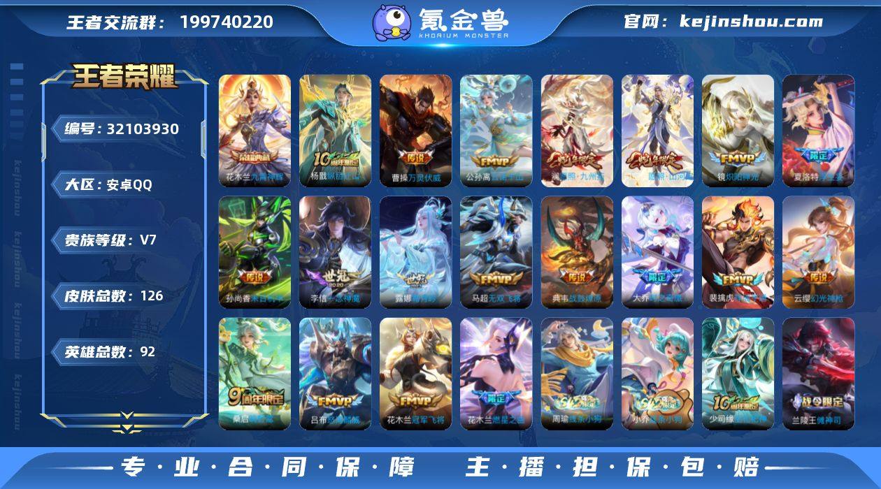 安卓Q-V7-至尊星耀II段位-92英雄-126皮肤-1典藏皮肤-21传说-43史诗【英雄全皮】:夏洛特全皮【荣耀典藏】:花木兰九霄神辉【传说皮肤】:关羽神骥镇沧海,花木兰异界灵契,杨戬纵目迁山,曹操万灵伏威,公孙离云诺千山,司空震愿照山河定,澜愿照九州拓,云缨幻光神枪,裴擒虎祥瑞亨通,桑启鸣野蒿,典韦战鼓燎原,露娜霜月吟,大乔时之奇旅,夏洛特浮生妄,花木兰燃星之曲,吕布怒海麟威,马超无双飞将,镜炽阳神光,李信一念神魔,花木兰冠军飞将,孙尚香末日机甲【限定皮肤】:狄仁杰阴阳师,赵云皇家上将,赵云百木心枪,马可波罗山海玄木吟,狄仁杰魔术师,项羽海滩派对,韩信傲雪梅枪,花木兰燃星之曲,大乔时之奇旅,西施玲珑珍味,蒙犽狂想玩偶喵,夏洛特浮生妄,艾琳流音漫舞,妲己灵卜魔法,沈梦溪龙舞盛年【年限皮肤】:马可波罗山海玄木吟,司空震愿照山河定,澜愿照九州拓【赛季限定】:太乙真人谧流熔炉,钟馗虚灵犬护,甄姬逆浪荇歌,亚瑟荣光之誓【战令限定】:蒙犽狂想玩偶喵,西施玲珑珍味,艾琳流音漫舞,妲己灵卜魔法,孙膑茶境仙,马超访茗客,刘禅鸭鸭历险记,沈梦溪鸭鸭历险记,周瑜百相守梦,孙策百相守梦,兰陵王傩神司,莱西奥光弋星穹,明世隐往忆晖光,周瑜线条小狗,小乔线条小狗【史诗皮肤】:周瑜线条小狗,小乔线条小狗,少司缘巫礼祀神,兰陵王傩神司,莱西奥光弋星穹,公孙离涂山容容,朵莉亚幻珠鲛人,黄忠百相守梦,云缨赞萌露比,周瑜百相守梦,百里守约雪豹霜爪,扁鹊灵蛊蚀心,狂铁龙之律动,刘禅鸭鸭历险记,阿轲化蝶舞,芈月瑰影绮梦,弈星万物之道,孙膑茶境仙,妲己灵卜魔法,马可波罗山海玄木吟,赵云百木心枪,夏洛特永昼,韩信傲雪梅枪,百里玄策热力回旋,蒙犽狂想玩偶喵,公孙离无限星赏官,狄仁杰鹰眼统帅,白起星夜王子,程咬金功夫厨神,安琪拉心灵骇客,雅典...