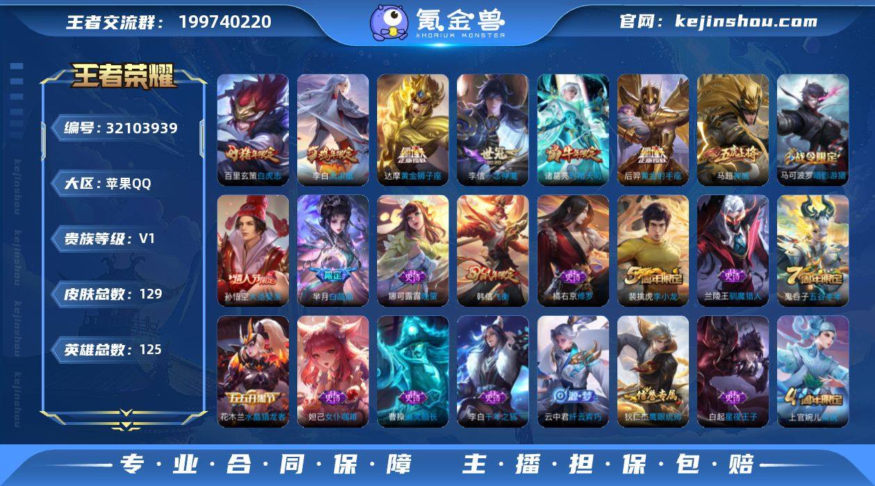 苹果Q-V0-尊贵铂金I段位-125英雄-129皮肤-6传说-36史诗【传说皮肤】:诸葛亮时雨天司,李信一念神魔,达摩黄金狮子座,百里玄策白虎志,后羿黄金射手座,李白凤求凰【限定皮肤】:狄仁杰阴阳师,赵云皇家上将,鲁班七号狮舞东方,庄周高山流水,芈月白晶晶,周瑜赤莲之焰,夏侯惇朔风刀,马可波罗暗影游猎,狄仁杰魔术师,狄仁杰万华元夜,达摩星际陆战队,达摩沙漠行僧,项羽海滩派对,老夫子醍醐杖,程咬金演武夺筹,韩信飞衡,兰陵王驯魔猎人,兰陵王金庭之子,孙悟空大圣娶亲,牛魔御旌,李元芳云中旅人,钟馗神迹守卫,钟馗驱傩正仪,雅典娜单词大作战,雅典娜黎明之约,鬼谷子原初探秘者,鬼谷子五谷丰年,诸葛亮时雨天司,苏烈千军破阵,百里玄策白虎志,百里玄策原初追逐者,弈星混沌棋,梦奇顽趣,沈梦溪大漠名商,明世隐疑决卦,裴擒虎李小龙,裴擒虎擒涛扼浪,米莱狄御霄,米莱狄胡桃异想国,云中君纤云弄巧,伽罗天狼溯光者,盾山御銮,猪八戒西部大镖客,上官婉儿梁祝,蒙犽狂想玩偶喵,鲁班大师探海日志,桑启海盐诗旅,艾琳女武神【年限皮肤】:李白凤求凰,百里玄策白虎志,韩信飞衡,诸葛亮时雨天司【赛季限定】:米莱狄御霄,牛魔御旌,盾山御銮,夏侯惇朔风刀,弈星混沌棋,明世隐疑决卦,老夫子醍醐杖,鬼谷子原初探秘者,狄仁杰万华元夜,程咬金演武夺筹,钟馗驱傩正仪,苏烈千军破阵,达摩沙漠行僧,兰陵王金庭之子,沈梦溪大漠名商,李元芳云中旅人,桑启海盐诗旅,裴擒虎擒涛扼浪,鲁班大师探海日志,百里玄策原初追逐者,雅典娜黎明之约,梦奇顽趣【战令限定】:鲁班七号狮舞东方,钟馗神迹守卫,兰陵王驯魔猎人,周瑜赤莲之焰,马可波罗暗影游猎,猪八戒西部大镖客,蒙犽狂想玩偶喵,雅典娜单词大作战,米莱狄胡桃异想国,达摩星际陆战队【史诗皮肤】:梦奇顽趣,鬼谷子五谷丰年,雅典...