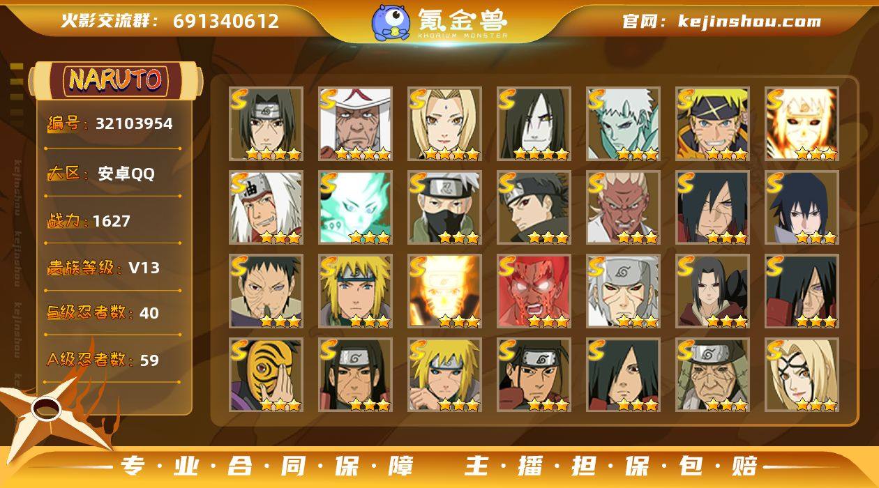 【火影忍者】战斗力:1627W+;段位:见习1阶;本服排名:176;VIP:V13级;S忍:40个;A忍:59个;通灵兽:23个,S忍:十尾人柱力宇智波带土|秽土转生解宇智波斑|白面具宇智波斑|忍界大战宇智波带土|须佐能乎旗木卡卡西|秽土转生千手扉间|九喇嘛连结波风水门|天道佩恩|传说中的三忍自来也|漩涡鸣人宇智波佐助|须佐能乎宇智波止水|秽土转生千手柱间|秽土转生宇智波鼬|永恒万花筒宇智波佐助|最终章大筒木舍人|忍界大战艾|舞之豪杰自来也|大蛇丸(普通) * 4星|纲手(普通) * 4星|百豪纲手|波风水门|秽土转生波风水门|千手柱间(普通)|秽土转生宇智波斑|宇智波斑(普通)|须佐能乎宇智波鼬 * 4星|神秘面具男(普通)|秽土转生长门|秽土转生金角银角|二代目土影无|二代目水影鬼灯幻月|四代目雷影艾|仙人模式药师兜|死门迈特凯|忍界大战春野樱|九喇嘛连结漩涡鸣人|博人传大筒木金式|猿飞日斩(普通) * 4星|秽土转生猿飞日斩|自来也(普通)__A忍:青春爆炸迈特凯|仙人模式巳月|幻之真容旗木卡卡西|忍界大战李洛克|漂泊浪客佩恩六道|秽土转生角都|忍界大战日向宁次|四代目土影黑土|木叶上忍猿飞木叶丸|青年长门|忍者之路神秘面具男|秽土转生迪达拉|宇智波止水(普通)|新春限定宇智波止水|不风|忍界大战奇拉比|青年波风水门|青年艾|近松十人卫千代|半蛇斗篷药师兜|须佐能乎宇智波佐助|九尾查克拉漩涡鸣人|晓大蛇丸|百豪春野樱 * 3星|忍界大战秋道丁次|忍界大战我爱罗|秽土转生猿飞阿斯玛|夏日泳装小南|奇拉比(普通)|万花筒写轮眼宇智波佐助|五代目水影照美冥|五代目雷影达鲁伊|绝|死司凭血飞段|疾风传我爱罗 * 5星|迪达拉(普通)|飞段(普通) * 4星|小南(普通)|神驹佑将小南|仙人模式漩涡鸣人|万花筒写轮眼旗木卡卡西|迈特凯(普通) * 5星|宇智波鼬(普通)|干柿鬼鲛(普通) * 5星|桃地再不斩|秽土转生桃地再不...