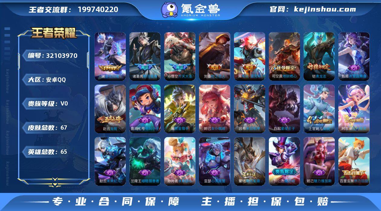 贵族等级:V0 典藏皮肤数:0 珍品无双皮肤数:0 无双皮肤数:0 珍品传说皮肤数:0 传说皮肤数:5 史诗皮肤数:21 皮肤数:67 英雄数:65 段位:钻石 卖家说:有多个区可刷元宝等还有区也有皮肤包含云鹰飞将马可深渊等