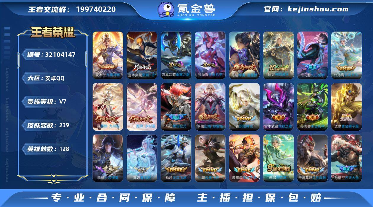 【精品推荐·九霄神辉·黑崎一护·神骥逐星野·愿照九州拓·姬愿照岁时盈·马超琥珀纪元·霜月吟·山海炽霜斩·冰锋战神】【可二次】YXw17953-安卓Q-128英雄-239皮肤-8王者印记-129铭文-贵族积分4w【贵族7】【1典藏·1珍品·2星传说·22传说·8按键】【因赛季更新游戏段付以上号为准!】 【英雄全皮】:孙权全皮,马超全皮,戈娅全皮,空空儿全皮 【荣耀典藏】:花木兰九霄神辉 【珍品传说】:宫本武藏黑崎一护 【星元皮肤】:宫本武藏幽冥之眼,孙尚香未来机甲 【传说皮肤】:马超神骥逐星野,后羿神树通天,司马懿九山相柳,公孙离云诺千山,澜愿照九州拓,虞姬愿照岁时盈,裴擒虎祥瑞亨通,桑启鸣野蒿,马超琥珀纪元,露娜霜月吟,孙悟空齐天大圣,李信山海炽霜斩,马超无双飞将,镜炽阳神光,曜云鹰飞将,李信一念神魔,张良黄金白羊座,干将莫邪久胜战神,达摩黄金狮子座,梦奇胖达荣荣,孙尚香末日机甲,宫本武藏地狱之眼 【限定皮肤】:蒙犽顽岩魄,蔡文姬夏日便利店,大乔绒语心约,虞姬夏日便利店,姜子牙天穹之誓,杨戬破阵退雄兵,狄仁杰阴阳师,赵云皇家上将,高渐离玩趣恶龙,芈月幻夜卜梦,马可波罗山海玄木吟,狄仁杰魔术师,狄仁杰万华元夜,项羽海滩派对,关羽冰锋战神,孙悟空齐天大圣,百里玄策原初追逐者,公孙离玉兔公主,裴擒虎擒涛扼浪,李信山海炽霜斩,伽罗天狼溯光者,上官婉儿梁祝,西施玲珑珍味,鲁班大师探海日志,桑启海盐诗旅,戈娅驭风魔法,司空震地狱燃心,阿古朵江河有灵,张良古海寻踪,蒙犽百解令,鬼谷子天穹祈灯,马超琥珀纪元,姬小满妄想食味,沈梦溪龙舞盛年,刘邦剑破天穹,程咬金群星魔术团,镜青焰无极,项羽苍威无极,刘备异域游侠,周瑜熔金海岸 【年限皮肤】:李信山海炽霜斩,马可波罗山海玄木吟,澜愿照九州拓,虞姬愿照岁时盈 【赛季限定】:狄仁杰万华元夜,桑启海盐诗旅...
