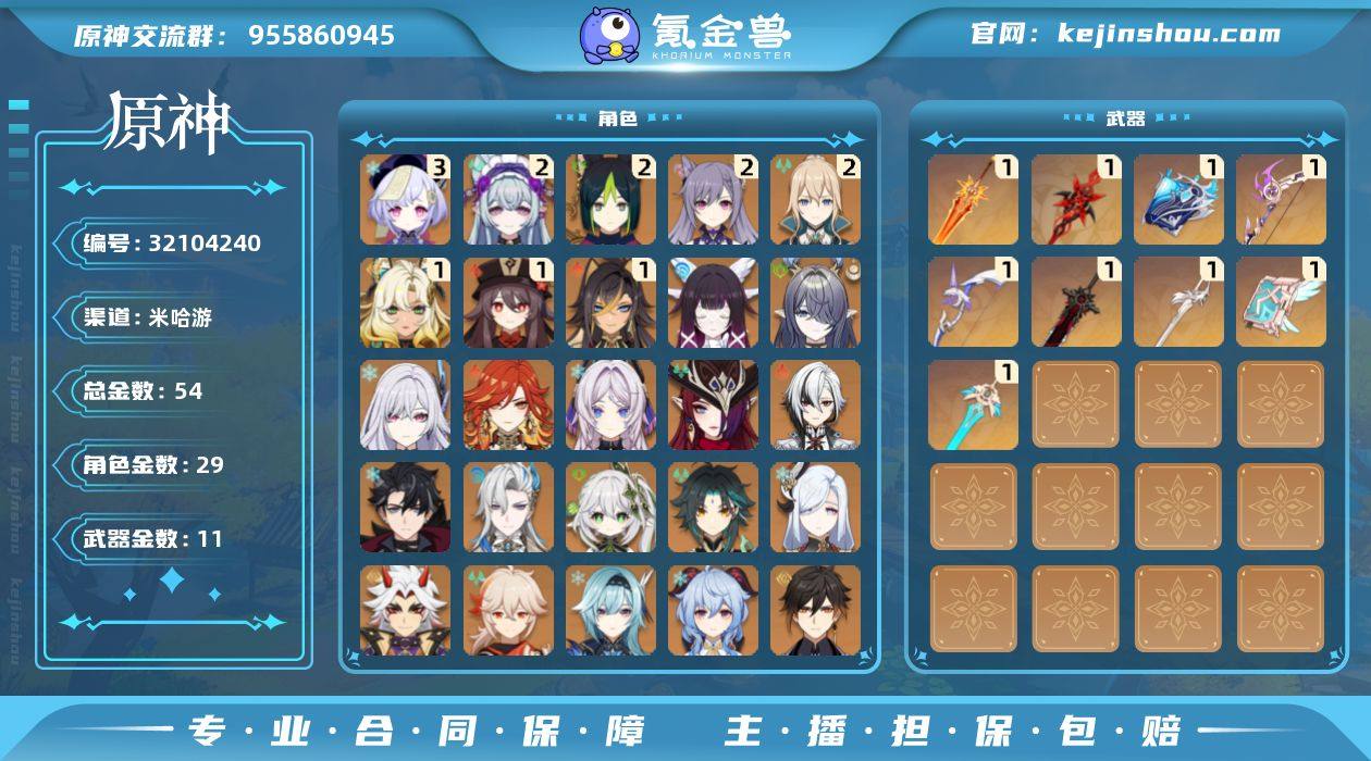 邮箱: 不送邮/死邮 总黄数: 54 冒险等级: 60 3命金色角色: 三命七七 2命金色角色: 二命刻晴,二命琴,二命提纳里,二命梦见月瑞希 1命金色角色: 一命胡桃,一命迪希雅,一命希诺宁 0命金色角色: 迪卢克,枫原万叶,优菈,可莉,达达利亚,钟离,莫娜,甘雨,魈,荒泷一斗,申鹤,纳西妲,那维莱特,莱欧斯利,阿蕾奇诺,恰斯卡,玛薇卡,茜特菈莉,丝柯克,菈乌玛,哥伦比娅 拥有武器: 狼的末路,飞雷之弦振,天空之卷,阿莫斯之弓,风鹰剑,天空之刃,万世流涌大典,赤月之形,焚曜千阳 1精武器: 狼的末路,飞雷之弦振,天空之卷,阿莫斯之弓,风鹰剑,天空之刃,万世流涌大典,赤月之形,焚曜千阳