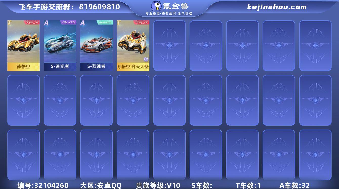 MCK630691 【孙悟空齐天大圣+2联赛】 A车数量32 游戏等级83 贵族等级10 车皮肤数量8 【安卓QQ】 【可以正常转区】 【可修改】 【V10】 永久T车1 永久T车皮肤1 永久A车2 竞速宠5 道具宠7 永久T车:T孙悟空; 永久T车皮肤:孙悟空齐天大圣; 永久A车:S烈魂者,S追光者; 竞速宠:雷震子,幻影战龙,天蓬元帅,嫦娥七号,潮汐之灵; 道具宠:蓬莱仙鹿,圣光灵狐,火麒麟,美人鱼,星梦精灵,昙花仙子,软糯甜心;