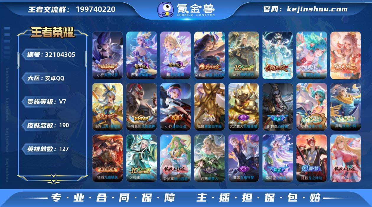 贵族等级:V7 典藏皮肤数:1 珍品无双皮肤数:0 无双皮肤数:0 珍品传说皮肤数:0 传说皮肤数:9 史诗皮肤数:59 皮肤数:190 英雄数:127 段位:传奇王者 卖家说:段位104星 妲己7000 小乔西施瑶6000战力 妲己小乔西施差两个全皮 少司缘全皮有西施瑶星传说 可砍价