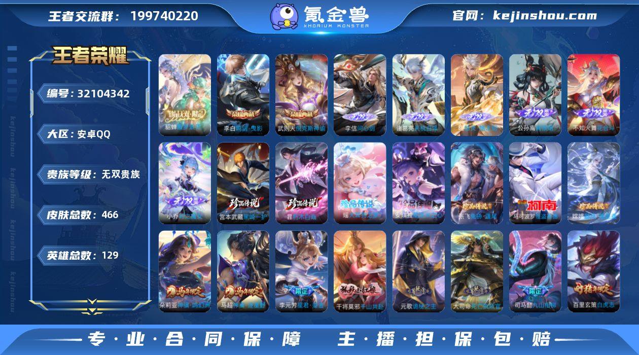 【王者荣耀】珍品无双1 典藏3 无双9 珍品传说8 传说63 史诗135 英雄129 皮肤466 贵族无双级 珍品无双:馥梦繁花__荣耀典藏:武则天|鸣剑·曳影|倪克斯神谕__无双皮肤:群星魔术团|时之魔女|真我赫兹|离恨烟|花合斗|雪境奇遇|器灵·螭龙剑|天机白泽|问心剑__珍品传说:怪盗基德|孙策-时之奇旅|器灵·落星盏|兔狲·蓬尾|大耳狗之梦|酷洛米之心|朽木白哉|黑崎一护__传说皮肤:鸣野蒿|深海之息|无双飞将|启示之音|绛天战甲|炽阳神光|启明星使|胖达荣荣|地狱之眼|海洋之心|仲夏夜之梦|久胜战神|黄金狮子座|黄金射手座|刘备-时之恋人|飞鸢探春|游龙清影|淬星耀世|浮生妄|鹤羽星尊|孙尚香-末日机甲|白虎志|大乔-时之奇旅|凤求凰|金乌负日|落雪白狼|马超-琥珀纪元|怒海麟威|祈雪灵祝|霜月吟|妄想奇谈|武圣|小动物乐团|星穹之声|永曜之星|战鼓燎原|逐花归海|乘龙·铭钟鼎|觅芳踪|山海·苍雷引|山海·炽霜斩|朵莉亚-心动手记|寅虎·赤拳|云中君-群星魔术团|至美·化雀舞|冥王哈迪斯|玄雷天君|祥瑞亨通|愿照·岁时盈|愿照·山河定|愿照·九州拓|愿照·众生和|愿照·福禄聚|愿照·千秋盛|千劫归真|九山相柳|死亡执政官|诡秘之主|千山共赴|神骥·鸣幻洲|神骥·逐星野|星君·娄金__稀有限定:寅虎·御盾|寅虎·展翼|寅虎·心曲|白晶晶|至尊宝|一生所爱|奇迹圣诞|蜜橘之夏|神威|白鹤梁神女|孙行者|山海·碧波行|时之彼端|冰锋战神|冰霜恋舞曲|冰霜神祇|大漠名商|古海寻踪|海滩派对|海盐诗旅|华丽摇滚|幻夜卜梦|皇家上将|辉光之辰|火炮绅士|剑破天穹|金庭之子|黎明之约|魔法小厨娘|魔术师|奇幻香踪|千军破阵|擒涛扼浪|青焰无极|驱傩正仪|燃音魔法|荣光圣徽|沙漠行僧|圣诞老人|死亡摇滚|探海日志|天降福星|天穹祈灯|阿古朵-顽趣|妄想食味|无心|五谷丰年|星界游侠|夜都怪侠|夜都魔契|阴阳师|吟游魔法|优雅恋人|游园惊梦|驭风魔法|原初追逐者|云间偶戏|真爱魔法|暗...