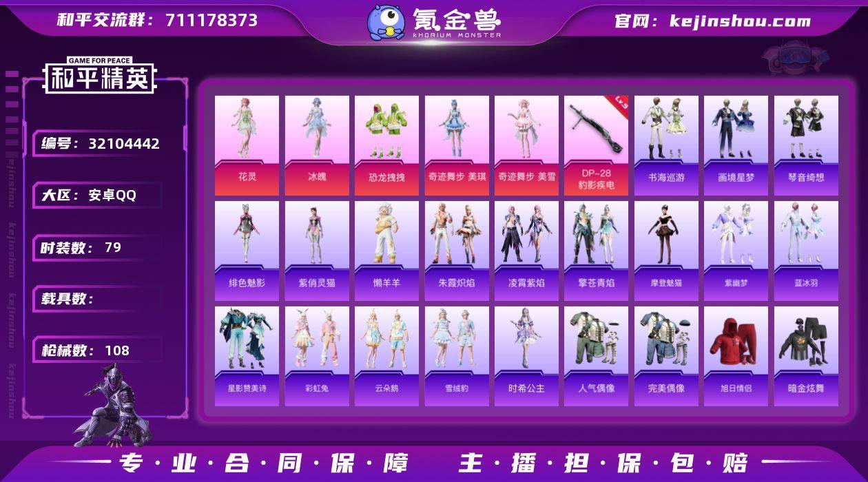 安卓 手Q-6粉装-5特效枪-0载具-3粉色飞行器-30539热力值-5王牌印记-79套装-108枪皮【粉色套装】:粉装-恐龙拽拽,角色-奇迹舞步 美琪,角色-奇迹舞步 美雪,角色-花灵,角色-冰魄,角色-辉云木星【粉色枪皮等级】:UMP45-萌骑冒险(二级),Mk14-福马献瑞(五级),M249-霁蓝缠春(六级),DP-28-豹影疾电(五级),MG-36-虹云熊熊(二级)【粉色枪皮】:UMP45-萌骑冒险,Mk14-福马献瑞,M249-霁蓝缠春,DP-28-豹影疾电,MG-36-虹云熊熊【粉色飞行器】:炫彩糖果飞行器,时光之誓飞行器,精灵菇菇飞行器【粉色降落伞】:甜心宝贝降落伞,恐龙拽拽降落伞,星穹咏叹调降落伞,无垠阁降落伞,异瞳寒姬降落伞,炫彩糖果降落伞,虹云熊熊降落伞【稀有套装】:套装-雪国风尚,套装-炫彩糖果,套装-马上来财,角色-摩登魅猫,套装-紫幽梦,套装-蓝冰羽,套装-星影赞美诗,套装-彩虹兔,套装-云朵鹅,套装-雪绒豹,角色-时希公主,套装-朱霞炽焰,套装-凌霄紫焰,套装-擎苍青焰,玩偶服-懒羊羊,角色-绯色魅影,角色-紫俏灵猫,套装-书海巡游,套装-画境星梦,套装-琴音绮想,套装-雨过天青,套装-红釉青花【稀有枪皮】:AUG-冰晶雪宝,AKM-缤纷海域,SCAR-L-夜灯,SCAR-L-炫彩节奏,SCAR-L-玉兔迎春,M416-红色方程式,GROZA-荧海星豚,AUG-甜蜜菠萝,AUG-耀粉歌者,M762-第五大道,M762-云朵鹅,Mk47-虹云熊熊,G36C-星穹咏叹调,ACE32-画境星梦,ARX-凌霄紫焰,UZI-啾咪啾咪,UZI-天降萌叽,UMP45-夜灯,UMP45-生命誓言,Vector-生命誓言,MP5K-画境星梦,JS9-凌霄紫焰,M24-幻彩电音,AWM-奇迹舞步,SKS-迅猛狂鲨,VSS-星之彼岸,AMR-喜羊羊与灰太狼,SVD-云朵鹅,M1加兰德-画境星梦,S12K-夜灯,DBS-幻彩电音,AA12-G-画境星梦,SPAS-12-云朵鹅,M249-糯团青竹,MG3-第五大道,MG-36-凌霄紫焰,P92-凌霄紫焰,信号枪-奇迹舞步,...