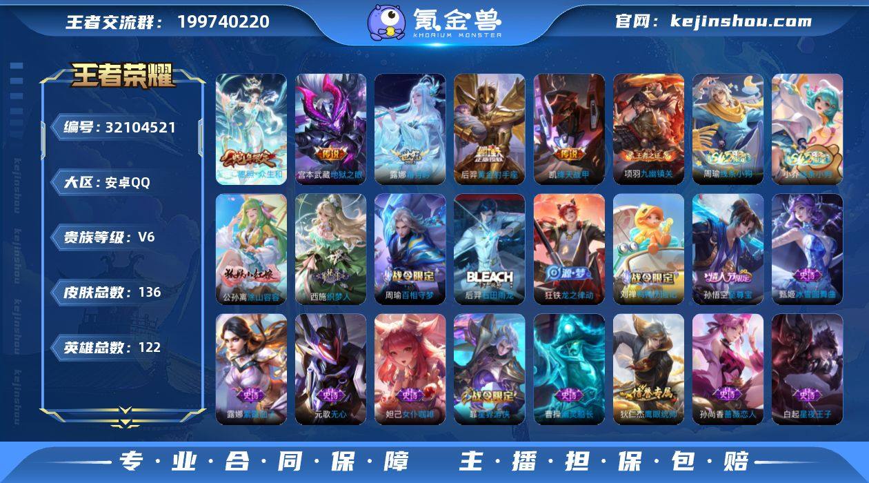 安卓Q-V6-最强王者段位-122英雄-136皮肤-1典藏皮肤-6传说-36史诗【荣耀典藏】:安琪拉颠倒童话魔镜【传说皮肤】:貂蝉神骥聚万邦,妲己愿照众生和,露娜霜月吟,铠绛天战甲,后羿黄金射手座,宫本武藏地狱之眼【限定皮肤】:蒙犽顽岩魄,姜子牙天穹之誓,狄仁杰阴阳师,赵云皇家上将,孙尚香蔷薇恋人,元歌无心,狄仁杰魔术师,项羽海滩派对,兰陵王金庭之子,亚瑟潮玩骑士王,孙悟空至尊宝,李元芳云中旅人,沈梦溪大漠名商,裴擒虎擒涛扼浪,嫦娥暖冬兔眠,蒙犽狂想玩偶喵,鲁班大师探海日志,桑启海盐诗旅,暃星界游侠,妲己灵卜魔法,李元芳蔬乡物语,刘邦剑破天穹,项羽苍威无极【年限皮肤】:妲己愿照众生和【赛季限定】:兰陵王金庭之子,沈梦溪大漠名商,李元芳云中旅人,桑启海盐诗旅,裴擒虎擒涛扼浪,鲁班大师探海日志,刘邦剑破天穹,姜子牙天穹之誓,太乙真人谧流熔炉,钟馗虚灵犬护,甄姬逆浪荇歌,项羽九幽镇关【战令限定】:蒙犽狂想玩偶喵,亚瑟潮玩骑士王,暃星界游侠,嫦娥暖冬兔眠,妲己灵卜魔法,李元芳蔬乡物语,项羽苍威无极,孙悟空神迹守卫,孙膑茶境仙,马超访茗客,刘禅鸭鸭历险记,沈梦溪鸭鸭历险记,周瑜百相守梦,孙策百相守梦,周瑜线条小狗,小乔线条小狗【史诗皮肤】:明世隐百晓客,周瑜线条小狗,小乔线条小狗,项羽九幽镇关,公孙离涂山容容,西施织梦人,周瑜百相守梦,后羿石田雨龙,狂铁龙之律动,刘禅鸭鸭历险记,孙膑茶境仙,蒙犽顽岩魄,妲己灵卜魔法,暃星界游侠,元歌无心,蒙犽狂想玩偶喵,狄仁杰鹰眼统帅,孙策猫狗日记,阿轲节奏热浪,白起星夜王子,李元芳逐浪之夏,蔡文姬舞动绿茵,百里守约特工魅影,孙悟空至尊宝,张飞乱世虎臣,曹操幽灵船长,墨子龙骑士,妲己女仆咖啡,妲己魅力维加斯,嬴政摇滚巨星,孙尚香水果甜心,孙尚香蔷薇恋人,宫本武藏鬼剑武藏,...