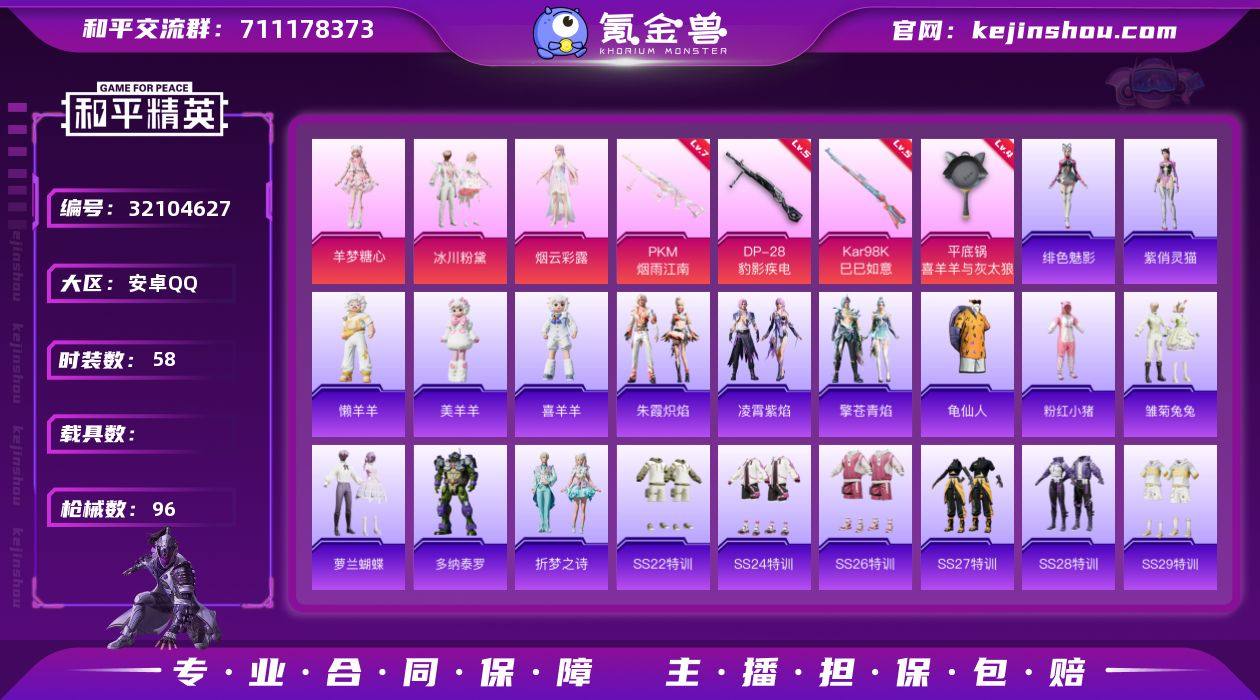 YZJ11712-无二次-安卓Q-3粉装4特效枪2热门58套装96枪皮 28986热力值 精品女号 189扭蛋碎片 美羊羊主套羊梦糖心 烟云彩露 冰川粉黛 喜羊羊 美羊羊 懒羊羊 满级PKM江南烟雨 4级平底锅喜羊羊与灰太狼 喜羊羊与灰太狼头盔背包一套 3印记 历史卓越王牌12星 【3粉装】 烟云彩露 羊梦糖心 冰川粉黛 【4特效枪】 Kar98K-巳巳如意 (5级) DP-28-豹影疾电 (5级) PKM-江南烟雨 (7级) 平底锅-喜羊羊与灰太狼 (4级) 【2热门】 龟仙人 粉红小猪 营地ID:963473979