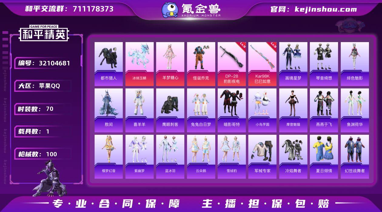 苹果 手Q-2粉装-4特效枪-1载具-3粉色飞行器-27615热力值-3王牌印记-70套装-100枪皮【热门品类】:粉装-怪诞乔克,套装-都市猎人,套装-暗影哥特【粉色套装】:粉装-怪诞乔克,角色-羊梦糖心【粉色枪皮等级】:AKS-74U-森灵之息(五级),Kar98K-巳巳如意(五级),DP-28-豹影疾电(五级),燃烧瓶-薄荷可可(七级)【粉色载具】:冰绡玉鳞【粉色枪皮】:AKS-74U-森灵之息,Kar98K-巳巳如意,DP-28-豹影疾电,燃烧瓶-薄荷可可【粉色飞行器】:炫彩糖果飞行器,戏水时光飞行器,灵珠游龙飞行器【粉色降落伞】:冷漠罗丽降落伞,魔童闹海 哪吒降落伞,魔童闹海 敖丙降落伞,炫彩糖果降落伞,罪夜之冕降落伞【稀有套装】:套装-小鸟芋圆,套装-雪国风尚,套装-炫彩糖果,角色-摩登魅猫,套装-燕燕于飞,套装-鱼渊荷华,套装-樱梦幻音,套装-紫幽梦,套装-蓝冰羽,套装-云朵鹅,套装-雪绒豹,玩偶服-喜羊羊,角色-敖闰,角色-绯色魅影,套装-画境星梦,套装-琴音绮想,角色-霜刃之御【稀有枪皮】:AUG-冰晶雪宝,AKM-影袭,AKM-破晓战魂,SCAR-L-玉兔迎春,GROZA-异彩先驱,GROZA-影袭,M762-第五大道,M762-镭射皇者,M762-云朵鹅,G36C-蛇蝎美人,AC-VAL-天降萌叽,ACE32-画境星梦,UZI-影袭,UZI-月影灵韵,UMP45-极意拳锋,Vector-生命誓言,MP5K-画境星梦,Kar98K-影袭,M24-影袭,MK20-H-樱桃泡泡,SVD-云朵鹅,SVD-冷漠罗丽,M1加兰德-画境星梦,S686-雪月幻音,S12K-玩趣呆呆,S12K-智耀战神,DBS-幻彩电音,AA12-G-画境星梦,SPAS-12-云朵鹅,MG3-幻世战舞者,PKM-小狗蛇点点,R45-幻彩电音,R45-雨林猎影,沙漠之鹰-云朵鹅,大砍刀-云朵鹅,平底锅-画境星梦【其他套装】:套装-军械专家,套装-冷焰舞者,套装-夏日倾情,套装-幻世战舞者,套装-幻影武者,套装-暗影哥特,套装-极速红龙,套装-深蓝色名流,套装-滨海厨...