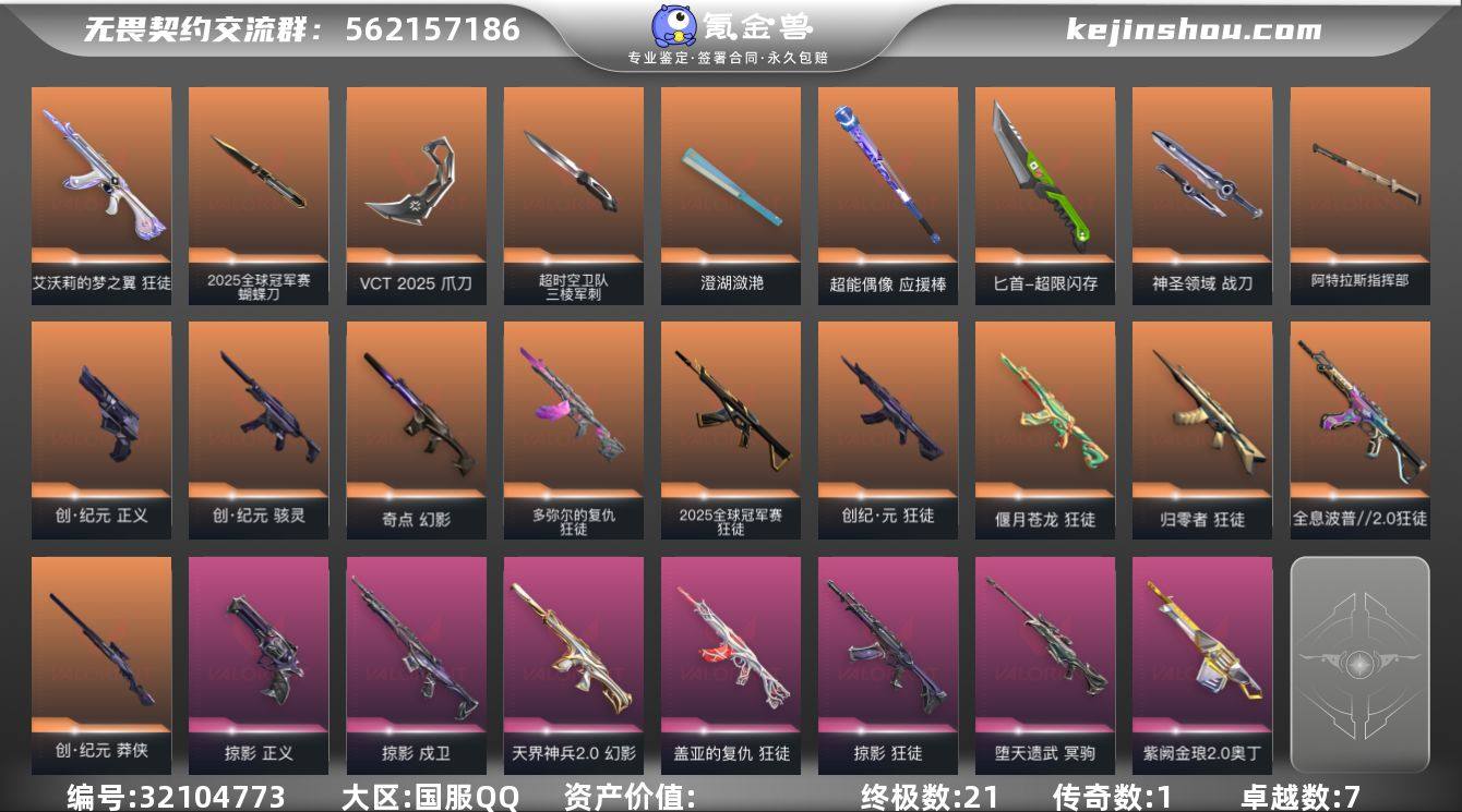 【套装】:2025全球冠军赛套装,VCT 2025 赛季套装,创·纪元套装【英雄】:幻棱,炼狱,维斯,暮蝶,钛狐,壹决,铁臂,捷风,雷兹,幽影,不死鸟,贤者,猎枭,零,芮娜,奇乐,尚勃勒,夜露,星礈,K/O,海神,盖可,黑梦【近战武器】:近战武器-2025全球冠军赛 蝴蝶刀,近战武器-超时空卫队 三棱军刺,近战武器-剥皮小刀,近战武器-VCT 2025 爪刀,近战武器-落英飞旋,近战武器-镭切,近战武器-澄湖潋滟,近战武器-超能偶像 应援棒,近战武器-超限闪存 匕首,近战武器-神圣领域 战刀,近战武器-阿特拉斯指挥部 甩棍【狂徒】:狂徒-2025全球冠军赛,狂徒-归零者,狂徒-全息波普//2.0,狂徒-偃月苍龙,狂徒-创·纪元,狂徒-多弥尔的复仇,狂徒-艾沃莉的梦之翼,狂徒-掠影,狂徒-盖亚的复仇,狂徒-超能偶像【幻影】:幻影-奇点,幻影-天界神兵//2.0,幻影-超限闪存,幻影-神圣领域,幻影-聚合之力【戍卫】:戍卫-掠影,戍卫-超能偶像,戍卫-浮光跃金,戍卫-月球哨兵【獠犬】:獠犬-神圣领域,獠犬-采蜜小蜂队,獠犬-模拟赫兹【冥驹】:冥驹-堕天遗武,冥驹-模拟赫兹,冥驹-星云暗涌【飞将】:飞将-聚合之力【莽侠】:莽侠-创·纪元,莽侠-超限闪存,莽侠-月球哨兵【战神】:战神-神圣领域,战神-采蜜小蜂队,战神-浮光跃金【奥丁】:奥丁-紫阙金琅//2.0【判官】:判官-超能偶像,判官-采蜜小蜂队【雄鹿】:雄鹿-模拟赫兹,雄鹿-月球哨兵【骇灵】:骇灵-创·纪元,骇灵-浮光跃金,骇灵-星云暗涌【蜂刺】:蜂刺-超限闪存,蜂刺-聚合之力,蜂刺-星云暗涌【标配】:标配-超能偶像,标配-浮光跃金【正义】:正义-创·纪元,正义-掠影,正义-超限闪存,正义-纳米打击,正义-月球哨兵【鬼魅】:鬼魅-诡秘蛇影,鬼魅-采蜜小蜂队,鬼魅-模拟赫兹,鬼魅-宿怨,鬼魅-星云暗涌【狂怒】:狂怒-神圣领域,狂怒-聚合之力【短炮】:短...