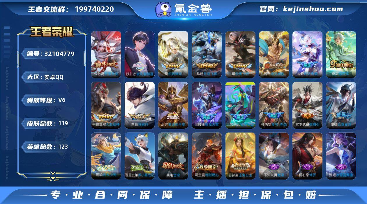 贵族等级:V6 典藏皮肤数:0 珍品无双皮肤数:0 无双皮肤数:0 珍品传说皮肤数:0 传说皮肤数:16 史诗皮肤数:37 皮肤数:119 英雄数:123 段位:荣耀王者 卖家说:目前荣耀王者可以直接换二次可小刀