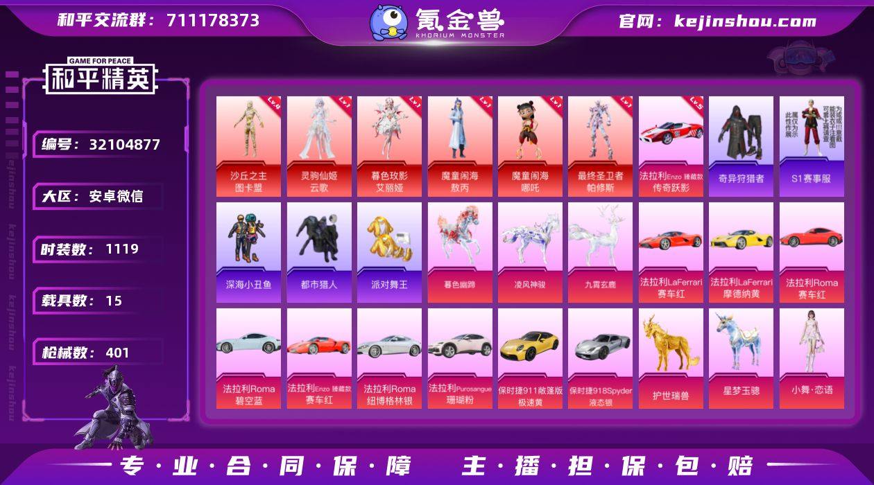 【精品号】100级收藏家 6红装225粉装32升级枪15车皮1飞机 【金鞋 s1上衣 都市猎人 M416-火箭少女101 赠送地铁三钻手枪 地铁满天赋 满级星梦奇缘 满级天马神君(M416) 4级暮色玫影(AKM)五级法拉利Enzo臻藏款(传奇跃影) 7台法拉利】 实名: 可修改 时装数: 1119 载具数: 15 枪械数: 401 战备数: 286 神级装扮: 沙丘之主-图卡盟,最终圣卫者-帕修斯,魔童闹海-哪吒,魔童闹海-敖丙,暮色玫影-艾丽娅,灵驹仙姬-云歌 热门装扮: 奇异狩猎者,梦幻火箭(新101),幻影战神,甜心巧克力,呆萌铁蟹,深海小丑鱼,宝贝奶油派,天使彩虹糖,迅捷狂鲨,木曜青龙,鹰眼刺客,都市猎人,星之彼岸,复仇流浪者,S1赛事上衣,派对舞王,仲夏莫吉托,蜜语绒猫,金丰海韵,樱桃泡泡,星月云朵,雪月幻音,羊梦糖心,星渊,异瞳寒姬,霁蓝缠春,角色-谜鸦审判,辉光之愿,烬夜之誓,女王,小舞·恋语,千仞雪 载具: 星梦玉骢,护世瑞兽,保时捷911敞篷版(极速黄),保时捷918Spyder(液态银),僚机-冰龙团团,暮色幽蹄,法拉利Enzo 臻藏款(传奇跃影),凌风神骏,九霄玄鹿,法拉利LaFerrari(赛车红),法拉利LaFerrari(摩德纳黄),法拉利Roma(赛车红),法拉利Roma(纽博格林银),法拉利Roma(碧空蓝),法拉利Purosangue(珊瑚粉),法拉利Enzo 臻藏款(赛车红) 稀有枪皮: MG3洛神天依,M416五爪金龙,M249猪猪侠,M200梦海之灵,AUG星梦奇缘,AUG-许七安,Kar98K-巳巳如意,SCAR-L金蛇镇世,M762-鬼刀,AMR-智耀战神,MG3-辉羽雀灵,Mk14-爆裂游戏,Vector-最终圣卫者,DP-28-豹影疾电,SCAR-L-魔童闹海 哪吒,P90-魔童闹海 敖丙,MG-36-沧焰双生,蜜獾-异瞳寒姬,AKM-暮色玫影,ACE32-绿头鱼,燃烧瓶-薄荷可可,AKS-74U-森灵之息,破片手榴弹-招财进宝,烟雾弹-好运连连,M416-天马神君,SCAR-L-灵驹仙姬,UMP45-萌骑冒险,GROZA-旋星之夜,MP7-G-水中影,汤姆逊-女王,M24-虎痴许褚