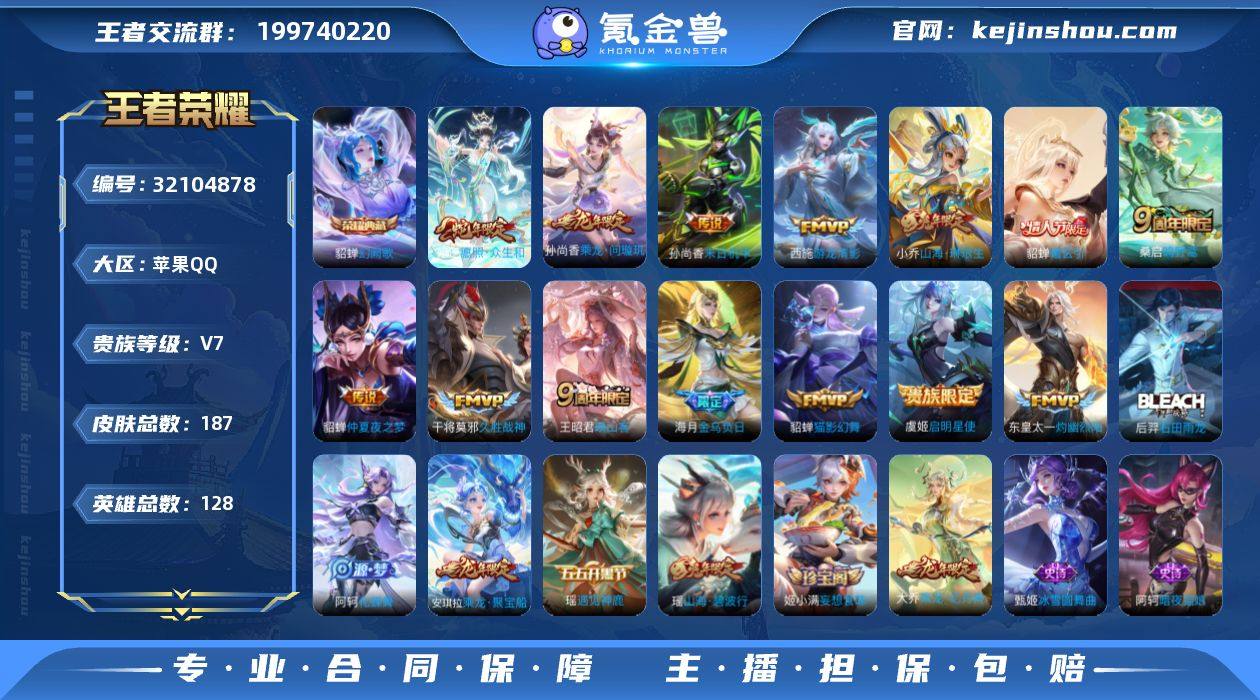 王者营地:2132079677 实名情况:可二次实名 是否支持人脸包赔:是 有无防沉迷:无防沉迷 是否可排位:是 VIP等级:V7 段位:钻石 水晶数量:0 英雄数量:128 皮肤数量:187 典藏数量:1 传说数量:14 史诗数量:57 召唤师等级:30 五级铭文:5 珍品无双数量:0 无双数量:0 珍品传说数量:0 荣耀典藏:貂蝉幻阙歌 传说皮肤:妲己愿照众生和,王昭君映山客,桑