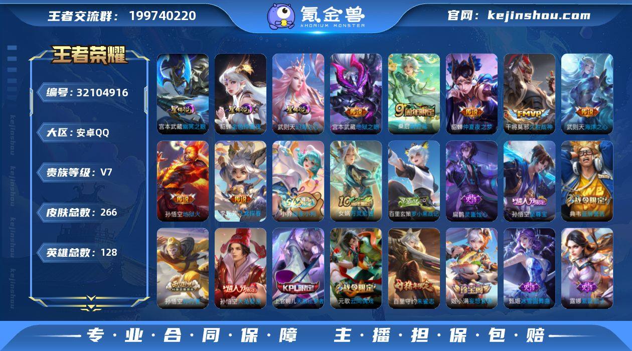 安卓Q-V7-最强王者段位-126英雄-286皮肤-8传说-77史诗【英雄全皮】:苍全皮,影全皮【传说皮肤】:后羿神树通天,妲己愿照众生和,澜愿照九州拓,虞姬愿照岁时盈,嬴政玄雷天君,桑启鸣野蒿,后羿黄金射手座,狄仁杰超时空战士【限定皮肤】:白起狰,姜子牙天穹之誓,杨戬破阵退雄兵,狄仁杰阴阳师,虞姬凯尔特女王,赵云皇家上将,孙尚香蔷薇恋人,鲁班七号狮舞东方,庄周高山流水,高渐离玩趣恶龙,孙膑妖精王,芈月重明,元歌云间偶戏,元歌无心,夏侯惇朔风刀,典韦穷奇,马可波罗暗影游猎,狄仁杰魔术师,狄仁杰万华元夜,达摩星际陆战队,达摩沙漠行僧,项羽海滩派对,老夫子醍醐杖,貂蝉逐梦之音,程咬金演武夺筹,兰陵王金庭之子,亚瑟潮玩骑士王,牛魔御旌,李元芳云中旅人,钟馗神迹守卫,钟馗驱傩正仪,干将莫邪胡桃夹子,蔡文姬繁星吟游,鬼谷子原初探秘者,鬼谷子五谷丰年,苏烈千军破阵,弈星混沌棋,梦奇顽趣,沈梦溪星空之诺,沈梦溪大漠名商,明世隐疑决卦,裴擒虎擒涛扼浪,狂铁御狮,米莱狄御霄,米莱狄胡桃异想国,云中君纤云弄巧,盾山御銮,猪八戒西部大镖客,嫦娥拒霜思,鲁班大师探海日志,桑启海盐诗旅,艾琳流音漫舞,司空震地狱燃心,阿古朵江河有灵,张良古海寻踪,蒙犽百解令,鬼谷子天穹祈灯,沈梦溪龙舞盛年,刘邦剑破天穹,程咬金群星魔术团,芈月浮光幕影,周瑜熔金海岸【赛季限定】:孙膑妖精王,白起狰,芈月重明,夏侯惇朔风刀,典韦穷奇,狄仁杰万华元夜,达摩沙漠行僧,老夫子醍醐杖,程咬金演武夺筹,兰陵王金庭之子,张良古海寻踪,牛魔御旌,李元芳云中旅人,虞姬凯尔特女王,钟馗驱傩正仪,鬼谷子原初探秘者,苏烈千军破阵,弈星混沌棋,梦奇顽趣,沈梦溪大漠名商,明世隐疑决卦,裴擒虎擒涛扼浪,狂铁御狮,米莱狄御霄,盾山御銮,鲁班大师探海日志,桑启海盐诗旅,鬼...