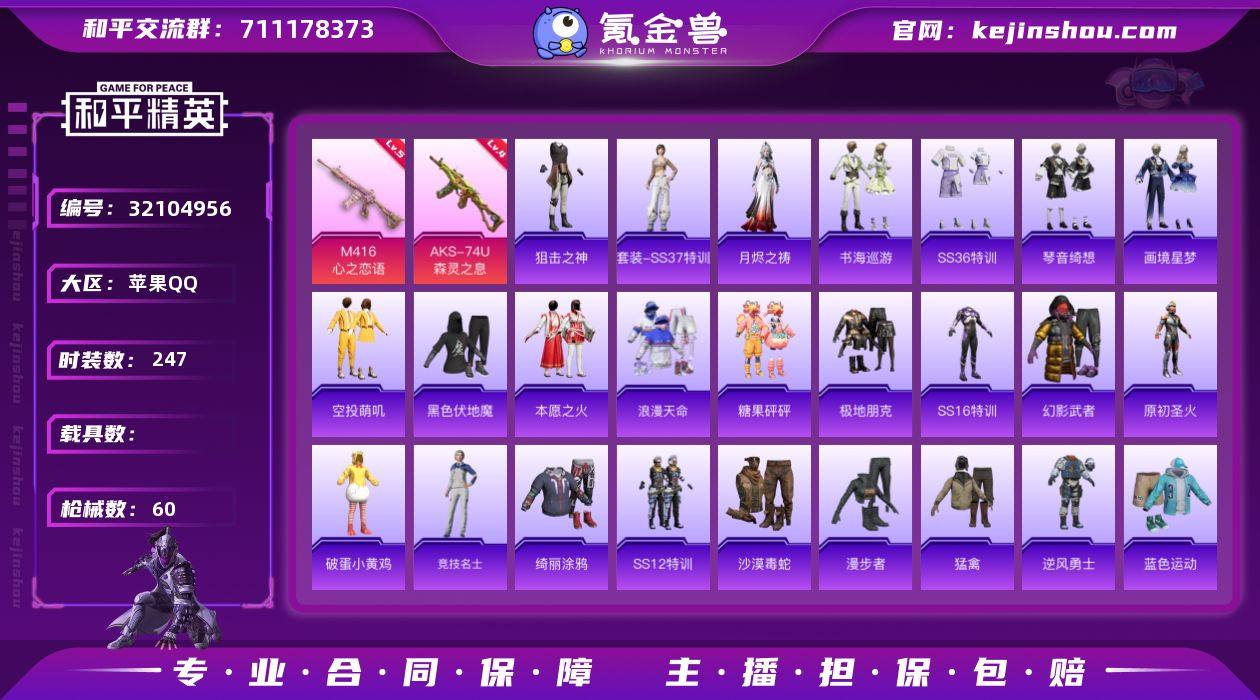 实名:可二次实名 是否支持人脸包赔:支持 特效枪数量:2 时装数:247 枪械数:60 五级M416-心之恋语,四级AKS-74U-森灵之息 狙击之神,SS37特训,月烬之祷,画境星梦,琴音绮想,书海巡游,SS36特训,冰川特警,冰冻风暴,滨海假日,白虎圣者,本愿之火,长空猛禽,福星高照,虎虎生威吉莉,黑色伏地魔,黄色运动,辉星之火,幻影武者,极地朋克,竞技名士,狂沙舞者,空投萌叽,浪漫天命,蓝色运动,漫步者,猛禽,魅力单车,逆风勇士,霓虹极客,牛气冲天,牛气满满,破蛋小黄鸡,绮丽涂鸦,青涩年华,骑行爱好者,瑞龙福将,沙漠毒蛇,SS12特训,SS13特训,SS16特训,SS17特训,SS18特训,SS19特训,糖果砰砰,甜蜜熊情侣,特殊使命,团圆交子,特战英豪,完美偶像,炫光向阳,原初圣火,异彩先驱,鹰眼刺客 罪夜之冕降落伞,花间之火降落伞,马卡龙降落伞,四圣焕新降落伞 卖家说:美国人agfox王者v9李白无双嫦娥珍品传说孙策珍品传说宫本武藏珍品传说马可波罗珍品传说铠荣耀典藏等等皮