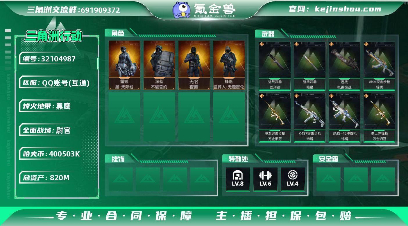 【SJZQH991】总资产(M):820M/哈夫币(K):400503K/哈夫币(K):400503K/传说枪皮数:34/全面战场等级:50_段位:尉官/烽火地带等级:60_段位:黑鹰/露娜-黑·天际线/蜂医-送葬人·无题密令(S5)/无名-夜鹰(S4)/深蓝-不破誓约(S6)/近战-暗星/近战-电锯惊魂/近战-处刑者/近战-黑鹰/M4A1突击步枪-阿米娅/AKM突击步枪-锦绣/ASh-12战斗步枪-鹅鸭杀/M16A4突击步枪-狩猎时刻/AUG突击步枪-悠然茶歇/AK-12突击步枪-夜鹰/AK-12突击步枪-特斯拉线圈/SCAR-H战斗步枪-启航/G3战斗步枪-狩猎时刻/G3战斗步枪-骑士/CAR-15突击步枪-阿米娅/AS Val突击步枪-蛇年祥瑞/腾龙突击步枪-万金泪冠/K437突击步枪-锦绣/MK47突击步枪-悠然茶歇/MK47突击步枪-暗星/Vector冲锋枪-狩猎时刻/UZI冲锋枪-特斯拉线圈/UZI冲锋枪-悠然茶歇/SMG45冲锋枪-骑士/SMG-45冲锋枪-锦绣/SR-3M紧凑突击步枪-特斯拉线圈/SR-3M紧凑突击步枪-暗星/勇士冲锋枪-能天使-午夜邮差/勇士冲锋枪-万金泪冠/QCQ171冲锋枪-鹅鸭杀/S12K霰弹枪-电锯惊魂/725双管霰弹枪-送葬人-无题密令/M250通用机枪-骑士之心/QJB201轻机枪-鹅鸭杀/M14射手步枪-电锯惊魂/SR-25射手步枪-水墨云图/AWM狙击步枪-万金泪冠/复合弓-黑-天际线/AKM突击步枪-林中猎手/QBZ95-1突击步枪-曙光/Ash-12战斗步枪-守夜人/ASh-12战斗步枪-无极限/K416突击步枪-竞技风/K416突击步枪-冬日风情/K416突击步枪-阿萨拉特攻/M16A4突击步枪-竞赛选手/AUG突击步枪-蝮蛇/SG552突击步枪-尖端治疗/SG552突击步枪-深海恐惧/SG552突击步枪-哈夫克警备/SCAR-H-猎鳄行动/SCAR-H战斗步枪-囚徒/G3战斗步枪-战场英杰/G3战斗步枪-哈夫克警备/AS Val突击步枪-刀锋/AS Val突击步枪-尖端治疗/腾龙突击步枪-无垢/腾龙突击步枪-猎鳄行动/K437突击步枪-守护者/MP5冲锋枪-深海恐惧/MP5冲锋枪-战术竞备/MP5冲锋枪-竞技风/P90冲锋枪-莫斯提马/Vector...