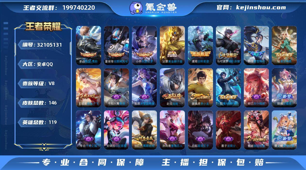 【王者荣耀】珍品无双0 典藏3 无双0 珍品传说0 传说3 史诗32 英雄119 皮肤146 贵族8级 荣耀典藏:无限飓风号|天鹅之梦|鸣剑·曳影__传说皮肤:孙尚香-异界灵契|启明星使|黄金狮子座__稀有限定:蔷薇恋人|龙胆|傲雪梅枪|李小龙|拒霜思|暗影游猎|大漠名商|繁星吟游|凤凰于飞|高山流水|海滩派对|皇家上将|金庭之子|狂想玩偶喵|魔术师|千军破阵|擒涛扼浪|驱傩正仪|沙漠行僧|死亡摇滚|探海日志|醍醐杖|万华元夜|演武夺筹|疑决卦|阴阳师|游园惊梦|缤纷独角兽|冰冠公主|冰雪圆舞曲|苍穹之光|金属风暴|龙骑士|魅力维加斯|魅语|女仆咖啡|偶像歌手|圣诞恋歌|水果甜心|星夜王子|鹰眼统帅|遇见神鹿|曙光守护者|心灵战警|千年之狐|心灵骇客|原初探秘者|云中旅人|单词大作战|死神来了__优质皮肤:尼罗河女神|一千零一夜|创世神祝|埃及法老|孤猎|熊喵少女|午夜歌剧院|露花倒影|未来旅行|激情绿茵|海之征途|绯红之刃|踏雪寻梅|启蛰|伊势巫女|威尼斯狂欢|第七人偶|潮流仙人|街头旋风|地府判官|赤焰之缨|福禄兄弟|隐刃|特种部队|三太子|精灵王|剑舞者|星航指挥官|爱与和平|花间舞|魇语军师|极冰防御线|花见巫女|棒球奇才|东海龙王|灼热之刃|圣殿之光|霓裳曲|加勒比小姐|阿摩司公爵|异域舞娘|精灵公主|修竹墨客|万圣前夜|功夫炙烤|瓷语鉴心|秘密基地|次元突破|鲨炮海盗猫|科学大爆炸|守护之力|坚韧之力|功夫老勺|幻想奇妙夜|海滩丽影|兔女郎|死亡骑士|黄金武士|少女阿狸|玩偶对对碰|宫本武藏-未来纪元|红桃皇后|忍·炎影|教廷特使|潮玩牛仔|铁甲之心|无尽征程|拳王|白色死神|程咬金-星际陆战队|哥特玫瑰|猪八戒-西部大镖客|缤纷绘卷|西施-归虚梦演|孙悟空-西部大镖客|牛魔-西部大镖客|鲁班大师-归虚梦演|乓乓大师|盾山-圆桌骑士|曜-归虚梦演|太乙真人-圆桌骑士|沉稳之力|化身博士|花好人间|特工战影|炽热元素使|妄想特派|无双福将__贵族等级...