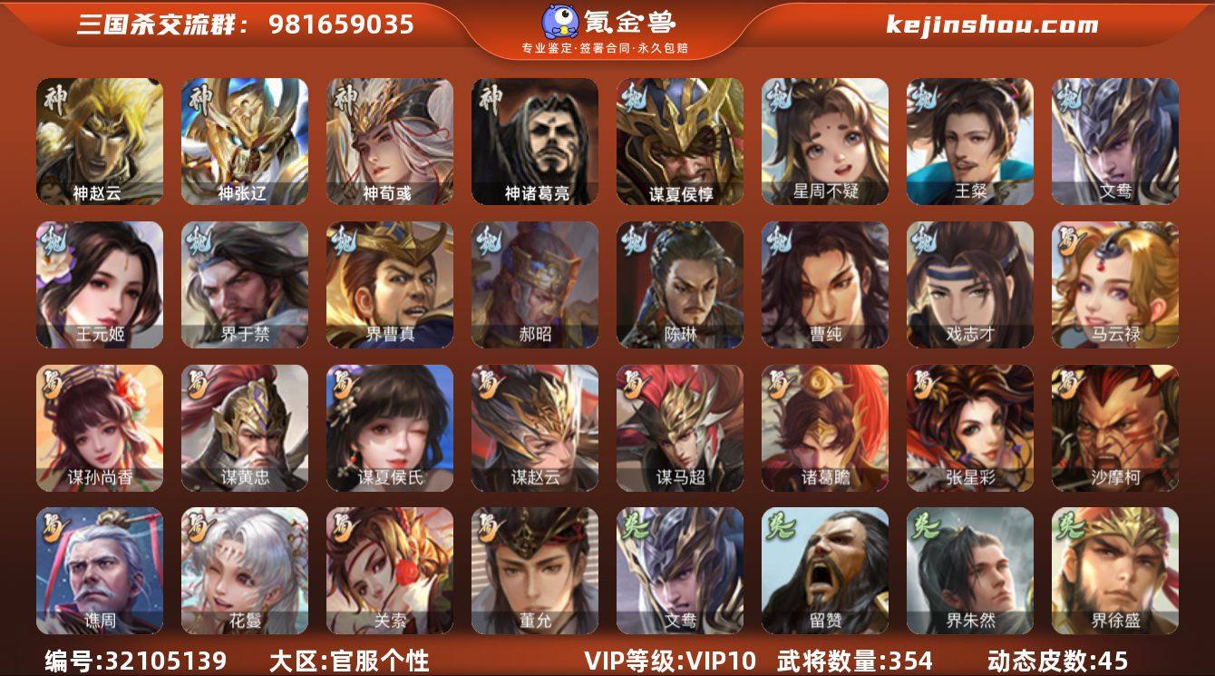 【1234】官阶:大将军;VIP等级:VIP10;史诗武将数量:41;动态皮肤数量:45;武将总数:354;史诗宝珠数量:22;将魂数量:8061;神将:6;魏国史诗武将:21;蜀国史诗武将:14;吴国史诗武将:4;群史诗武将:8 神赵云,神张辽,神荀彧,神吕蒙,神周瑜,神诸葛亮,星周不疑,王粲,文鸯,王元姬,魏-司马昭,界于禁,界曹真,郝昭,陈琳,曹纯,戏志才,谋夏侯惇,关索,马云騄,谋孙尚香,谋黄忠,谋夏侯氏,谋赵云,谋马超,诸葛瞻,张星彩,沙摩柯,谯周,花鬘,董允,留赞,界朱然,界徐盛,贺齐,左慈,星黄忠,麹义,沮授,界李儒,张绣,李傕,许攸,神荀彧-虎年清明(动态),神荀彧-匡汉延祚(动态),曹丕-气荡山河(动态),星周不疑-龙年清明(动态),曹丕-龙年中秋(动态),SP蔡文姬-兔年冬日(动态),荀彧-驱虎吞狼(动态),邓艾-神兵天降(动态),王粲-笔翰如流(动态),曹真-虎年春节(动态),曹纯-虎年春节(动态),王元姬-鼠年冬至(动态),司马昭-昭威淮南(动态),卧龙诸葛-龙跃凤鸣(动态),黄忠-明良千古(动态),诸葛瞻-绵竹之殇(动态),夏侯氏-猪年中秋(动态),SP孙尚香-猪年圣诞(动态),SP孙尚香-明良千古(动态),张星彩-猪年中秋(动态),张星彩-临军对阵(动态),关索-虎年七夕(动态),李丰-太仓聚粟(动态),周处-义除三害(动态),孙权-永开吴祚(动态),周瑜-免年清明(动态),孙尚香-兔年春节(动态),徐盛-破军杀将(动态),刘赞-灵魂歌王(动态),袁绍-声震寰宇(动态),张鲁-虎年冬至(动态)