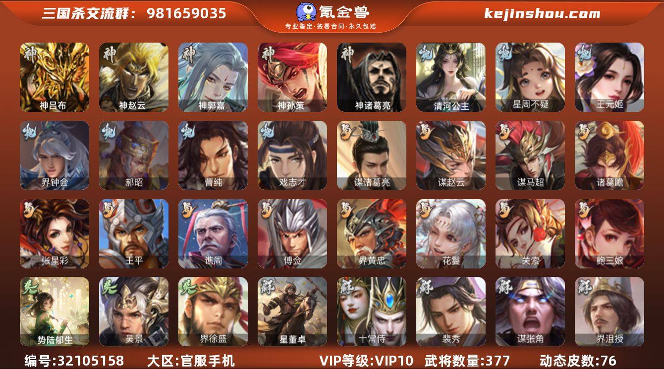 【1242】官阶:大将军;VIP等级:VIP10;史诗武将数量:43;动态皮肤数量:76;武将总数:377;史诗宝珠数量:10;将魂数量:564;神将:7;魏国史诗武将:28;蜀国史诗武将:12;吴国史诗武将:3;群史诗武将:16 神吕布,神赵云,神郭嘉,神孙策,神吕蒙,神周瑜,神诸葛亮,星周不疑,王元姬,魏-司马昭,界钟会,郝昭,曹纯,戏志才,清河公主,关索,谋诸葛亮,谋赵云,谋马超,诸葛瞻,张星彩,王平,谯周,傅佥,界黄忠,花鬘,鲍三娘,吴景,界徐盛,势陆郁生,十常侍,裴秀,界沮授,左慈,星黄忠,苏飞,麹义,南华老仙,界左慈,界李儒,卑弥呼,鲍信,谋张角,阎象,友徐庶,星董卓,神鲁肃-九州为局,神郭嘉-虎年清明(动态),神孙策-霸王再世(动态),神张辽-散敌擒孙,神吕蒙-心生万象,神曹操-天下归心,神吕布-冠绝天下(动态),神赵云-神龙天降,郭嘉-以身证道(动态),羊徽瑜-月耀华裳(动态),星周不疑-才广志宏(动态),钟会-龙年端午(动态),SP蔡文姬-兔年冬日(动态),邓艾-神兵天降(动态),界邓艾-神兵天降(动态),钟会-谋谟之勋(动态),界钟会-谋谟之勋(动态),曹昂-竭战麟伤(动态),王元姬-鼠年冬至(动态),司马昭-昭威淮南(动态),张辽-龙生九子(动态),星徐晃-斧引霹雳(动态),清河公主-魅影萦心(动态),刘备-龙御天下(动态),诸葛亮-龙年限定(动态),卧龙诸葛-龙跃凤鸣(动态),黄忠-烈箭贯云(动态),马超-明良千古(动态),赵云-牛年春节(动态),界赵云-牛年春节(动态),夏侯氏-猪年中秋(动态),SP孙尚香-明良千古(动态),关银屏-鼠年中秋(动态),关索-虎年七夕(动态),鲍三娘-虎年七夕(动态),诸葛果-蛇年限定(动态),太史慈-涤荡江东(动态),陆逊-龙年七夕(动态),孙权-永开吴祚(动态),周瑜-兔年七夕(动态),孙寒华-莲华熠熠(动态),孙尚香-兔年春节(动态),孙策-猪年七夕(动态),小乔-猪年大雪(动态),界小乔-猪年大雪(动态),徐盛-破军杀将(动态),步练师-牛年七夕(动态),孙寒华-蛇年限...