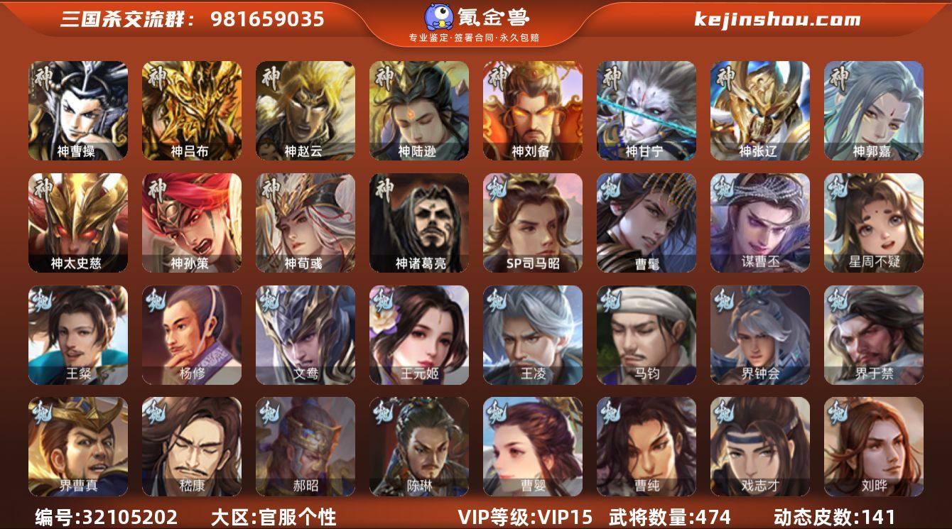 【1271】官阶:大将军;VIP等级:VIP15;史诗武将数量:86;动态皮肤数量:141;武将总数:474;史诗宝珠数量:11;将魂数量:11474;神将:15;魏国史诗武将:49;蜀国史诗武将:16;吴国史诗武将:10;群史诗武将:29 神曹操,神吕布,神赵云,神陆逊,神刘备,神甘宁,神张辽,神郭嘉,神太史慈,神孙策,神荀彧,神关羽,神吕蒙,神周瑜,神诸葛亮,SP司马昭,曹髦,星周不疑,王粲,杨修,文鸯,王元姬,王凌,魏-司马昭,马钧,界钟会,界于禁,界曹真,嵇康,郝昭,陈琳,曹婴,曹纯,戏志才,刘晔,谋曹丕,关索,谋刘备,马云騄,谋赵云,谋马超,诸葛瞻,周群,赵襄,张星彩,王平,沙摩柯,谯周,界黄忠,花鬘,董允,谋关羽,周处,吴景,孙寒华,骆统,留赞,界朱然,界徐盛,界步练师,贺齐,势陆郁生,十常侍,谋貂蝉,裴秀,界沮授,左慈,张让,杨彪,徐荣,星甘宁,王允,陶谦,苏飞,麹义,庞德公,祢衡,刘璋,刘焉,沮授,界左慈,界李儒,公孙康,杜预,卑弥呼,张绣,李傕,阎象,许攸,友徐庶,星董卓,神郭嘉-虎年清明(动态),神太史慈-勇撼日月(动态),神孙策-霸王再世(动态),神荀彧-虎年清明(动态),神荀彧-匡汉延祚(动态),神张辽-散敌擒孙,神赵云-鳞振九霄,神甘宁-战破无间,神吕蒙-心生万象,神甘宁-万人辟易(动态),神陆逊-绽焰摧枯(动态),神吕蒙-兼资文武(动态),神周瑜-陵光引灵(动态),神诸葛亮-孟章诛邪(动态),神曹操-天下归心,神曹操-玄天通冥(动态),神曹操-四方归心(动态),神吕布-监兵噬魅(动态),神吕布-冠绝天下(动态),神赵云-战龙在野(动态),星周不疑-才广志宏(动态),曹丕-气荡山河(动态),SP蔡文姬-兔年冬日(动态),许褚-虎啸生风(动态),司马懿-牛年立冬(动态),甄姬-牛年清明(动态),曹丕-牛年清明(动态),邓艾-神兵天降(动态),界司马懿-牛年立冬(动态),界许褚-虎啸生风(动态),界甄姬-牛年清明(动态),界曹丕-牛年清明(动态),界邓艾-神兵天降(动态),张春华-牛年立冬(动态),张春华-雪中舞刃(动态...
