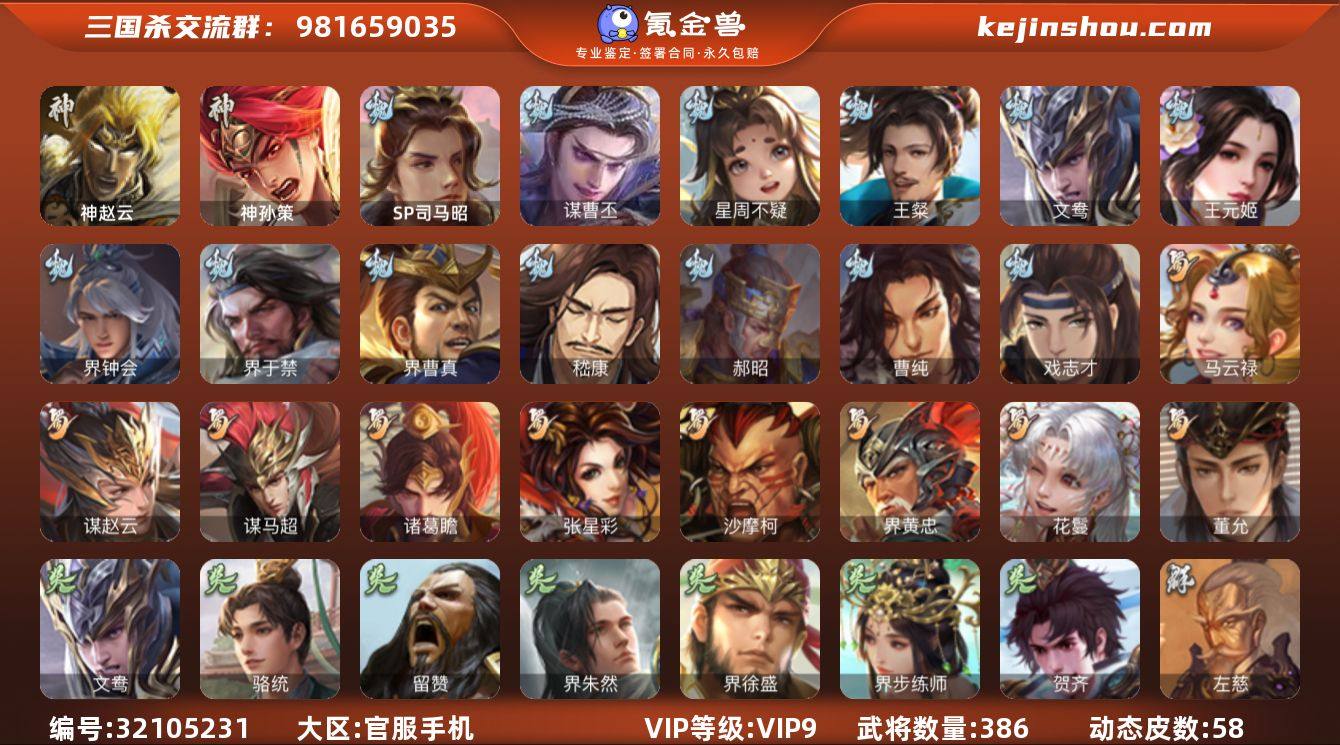【1294】官阶:大将军;VIP等级:VIP9;史诗武将数量:44;动态皮肤数量:58;武将总数:386;史诗宝珠数量:16;将魂数量:722;神将:4;魏国史诗武将:26;蜀国史诗武将:9;吴国史诗武将:6;群史诗武将:13 神赵云,神孙策,神吕蒙,神周瑜,SP司马昭,星周不疑,王粲,文鸯,王元姬,界钟会,界于禁,界曹真,嵇康,郝昭,曹纯,戏志才,谋曹丕,马云騄,谋赵云,谋马超,诸葛瞻,张星彩,沙摩柯,界黄忠,花鬘,董允,骆统,留赞,界朱然,界徐盛,界步练师,贺齐,左慈,张仲景,星甘宁,陶谦,苏飞,南华老仙,沮授,界左慈,界李儒,公孙康,卑弥呼,鲍信,张绣,神关羽-血海罗刹(动态),钟会-潜蛟觊天(动态),甄姬-明珠耀躯(动态),SP蔡文姬-兔年冬日(动态),许褚-虎啸生风(动态),郭嘉-十胜十败(动态),荀彧-驱虎吞狼(动态),界许褚-虎啸生风(动态),界郭嘉-十胜十败(动态),曹真-虎年春节(动态),曹昂-竭战麟伤(动态),戏志才-举棋若定(动态),曹婴-兔年春节(动态),曹纯-长坂败备(动态),诸葛亮-龙年限定(动态),卧龙诸葛-龙跃凤鸣(动态),刘备-龙骧麟振(动态),马超-牛年春节(动态),马超-虎年冬至(动态),黄月英-鼠年春节(动态),诸葛亮-明良千古(动态),诸葛瞻-绵竹之殇(动态),界刘备-龙骧麟振(动态),界马超-牛年春节(动态),界诸葛亮-明良千古(动态),界黄月英-鼠年春节(动态),关银屏-兔年春节(动态),鲍三娘-虎年七夕(动态),周处-义除三害(动态),吕蒙-剑起惊澜(动态),孙权-永开吴祚(动态),孙策-虎踞江东(动态),文鸯-破宇开天(动态),孙权-猪年端午(动态),孙尚香-兔年春节(动态),孙尚香-星流霆击(动态),界孙权-猪年端午(动态),界孙尚香-星流霆击(动态),徐盛-破军杀将(动态),步练师-牛年七夕(动态),界步练师-牛年七夕(动态),孙鲁育-牛年端午(动态),孙茹-鱼游濠水(动态),许攸-盛气凌人(动态),兀突骨-鼠年春节(动态),星甘宁-肝胆相照(动态)